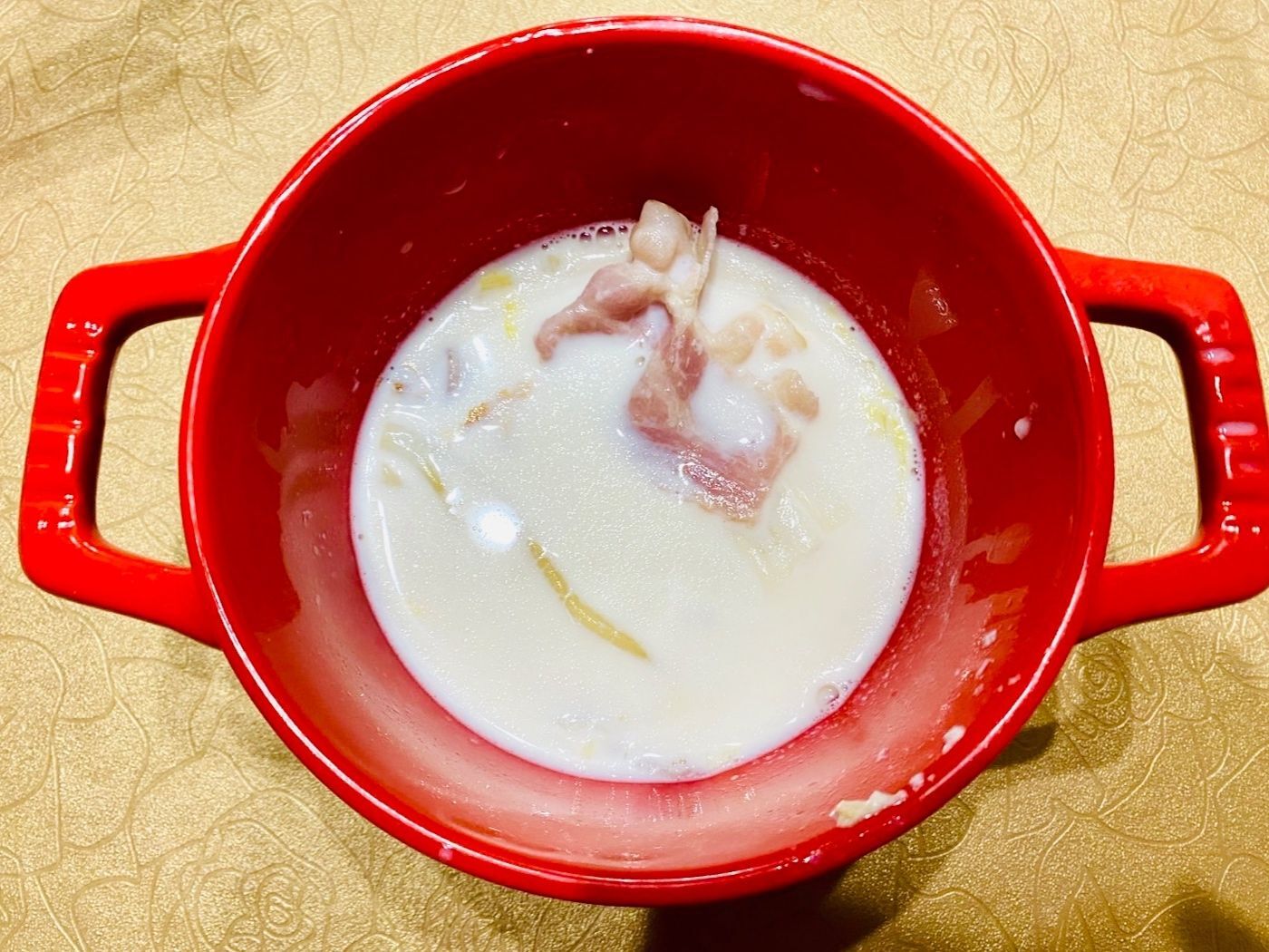 白菜がクタクタになったら、牛乳を入れます。