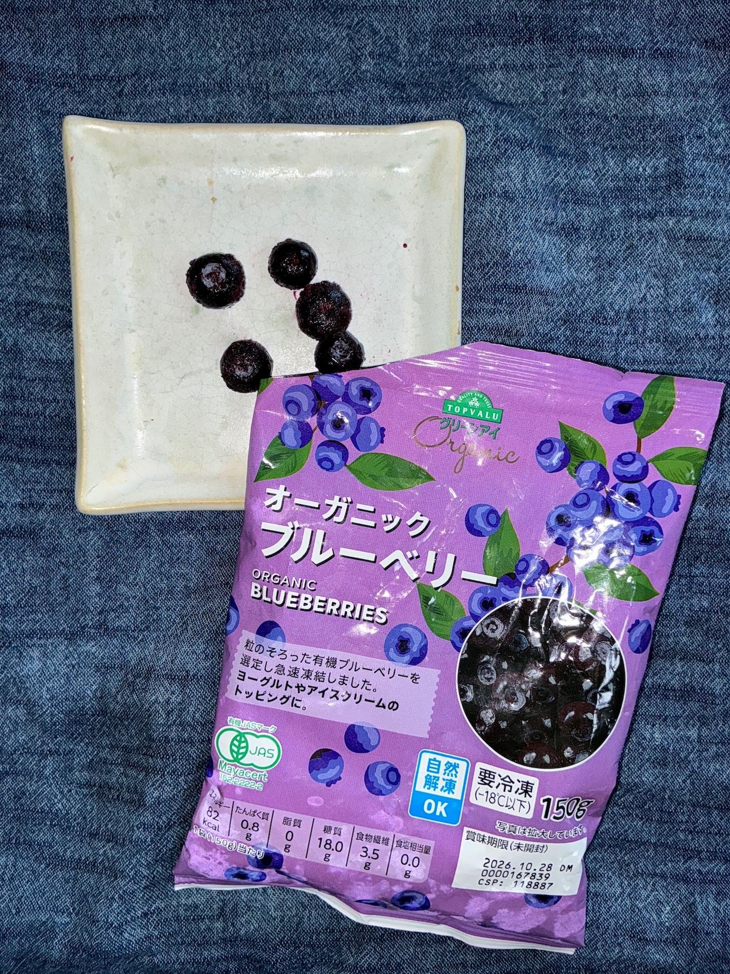 ブルーベリーは冷凍だが、同様にオーガニックである。写真はブルーベリーを開封した所。