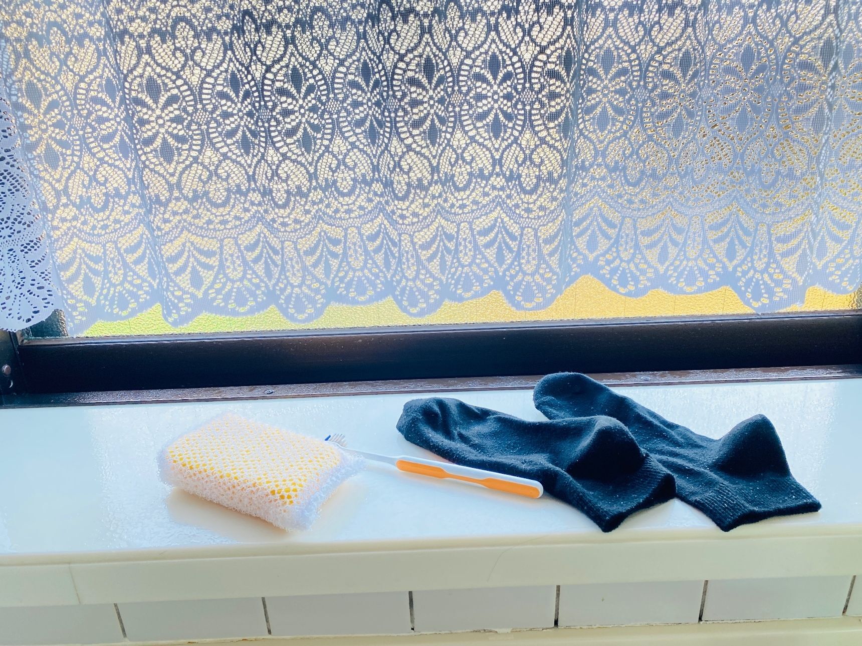 結露と一緒に発生する黒カビは、リサイクル歯ブラシで擦るだけで簡単に除去。後は着なくなった洋服、くたびれた靴下(洗濯済みのもの)、スポンジなどで拭くだけ。