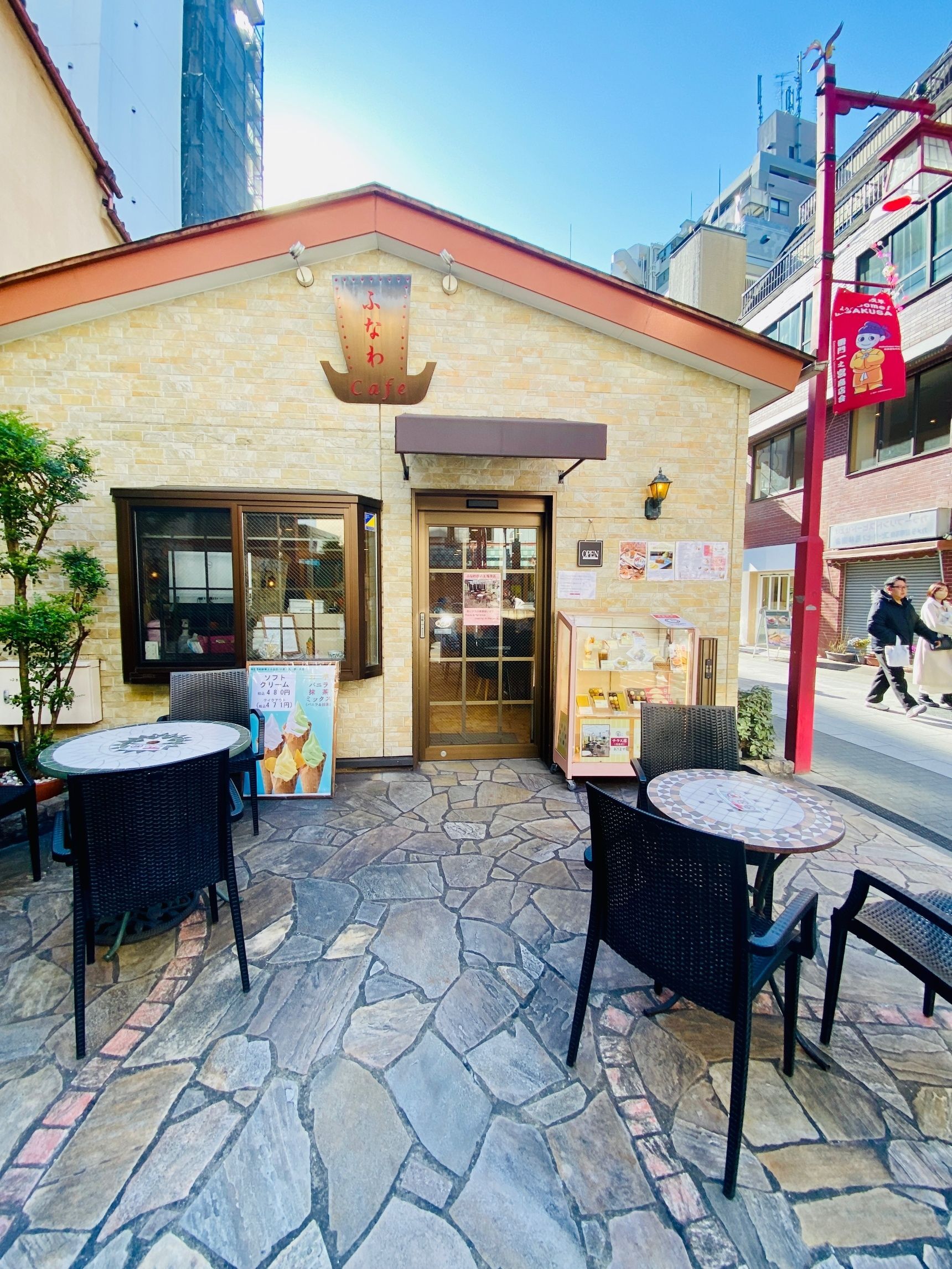 浅草といえば「舟和」浅草寺の大通りを渡ってすぐのところにとっても雰囲気の良い、「ふなわかふぇ 」浅草店がありました。店内は広々。