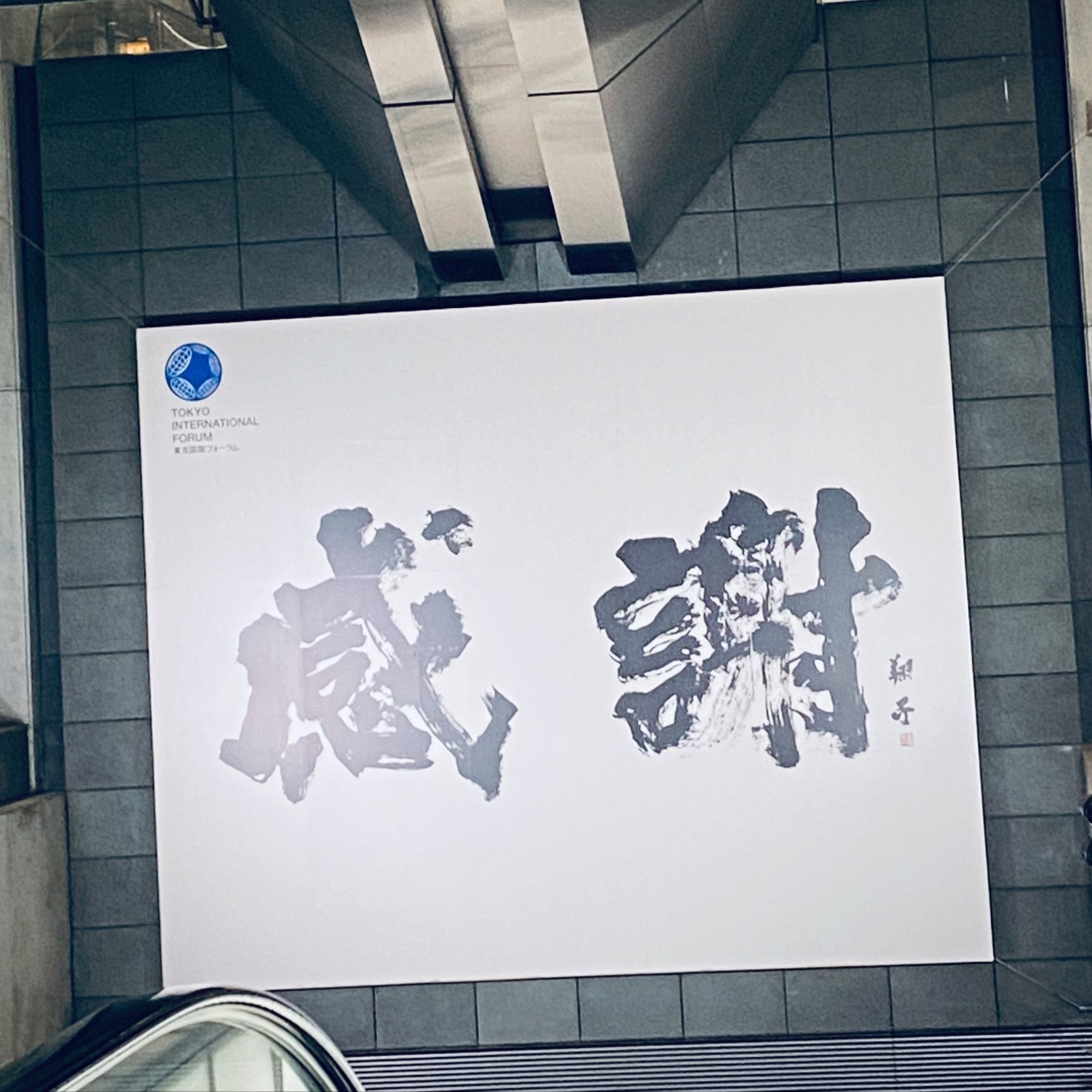「感謝」書道家金澤翔子氏の作品です。東京国際フォーラムの入り口にエスカレーター前に飾られていました。力強い堂々とした書で感動しました。