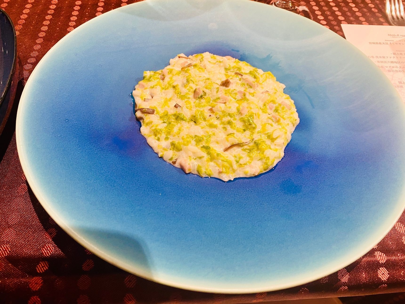 閖上のあおさのり、牛タンと名取市産オーガニックきくらげのリゾット