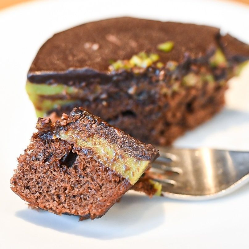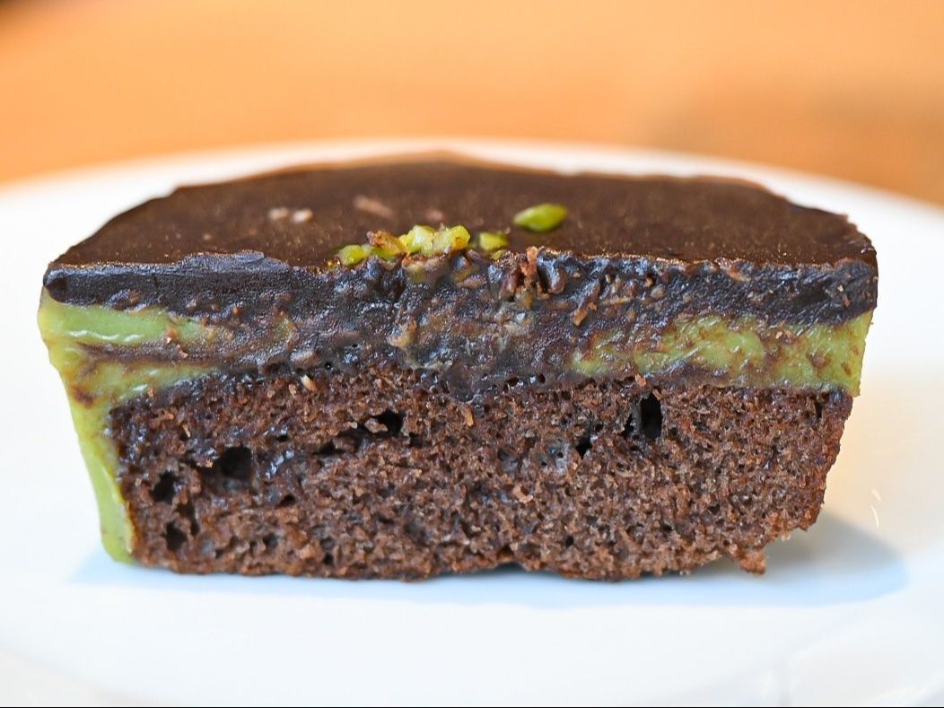 チョコパウンド生地の上にピスタチオチョコ生地を重ね、カダイフをのせたあとにコーティングのチョコを重ねている3層構造になっています。