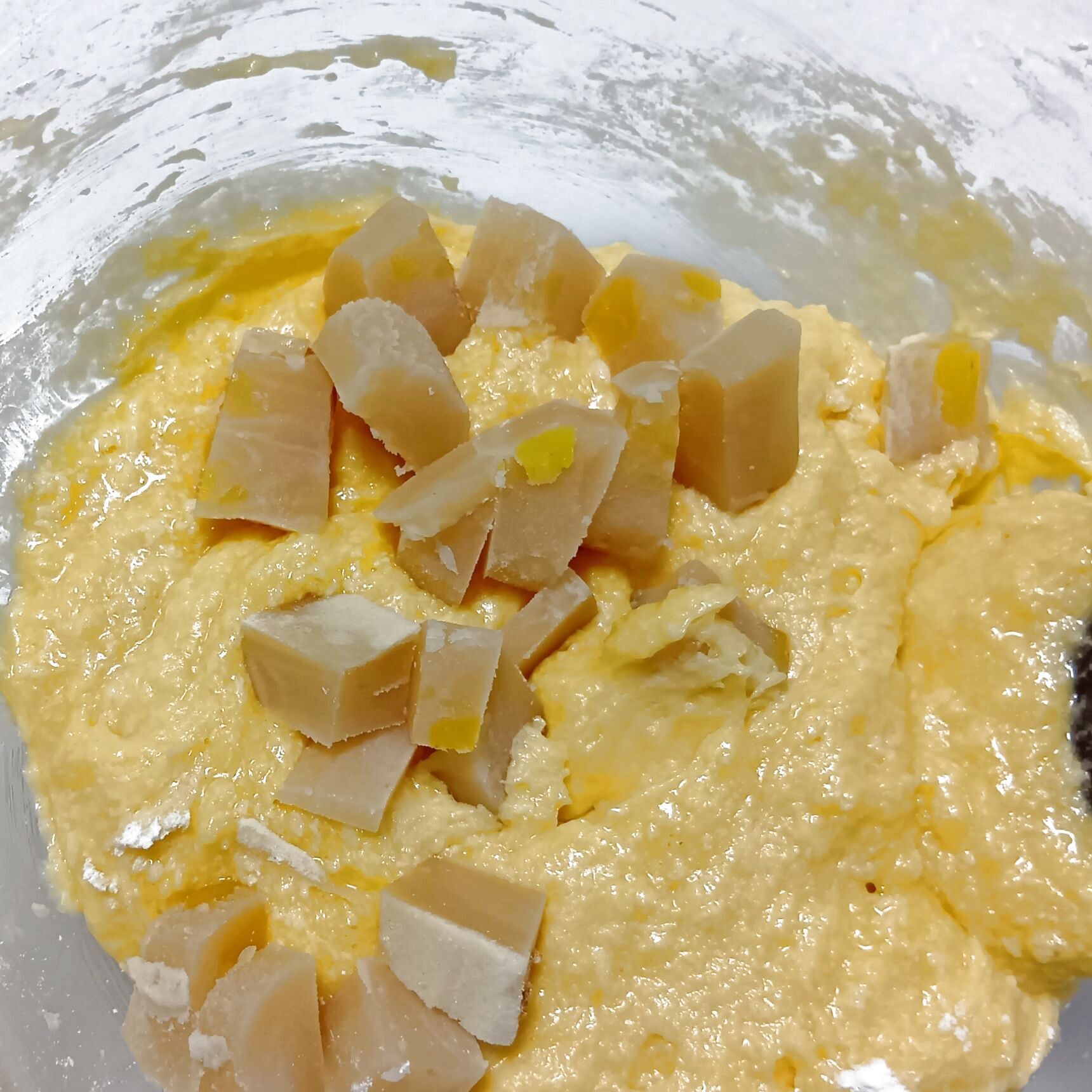 さらに、半解凍の状態で1~2cm角ほどに切った栗入りこし餡も加え混ぜ合わせます。