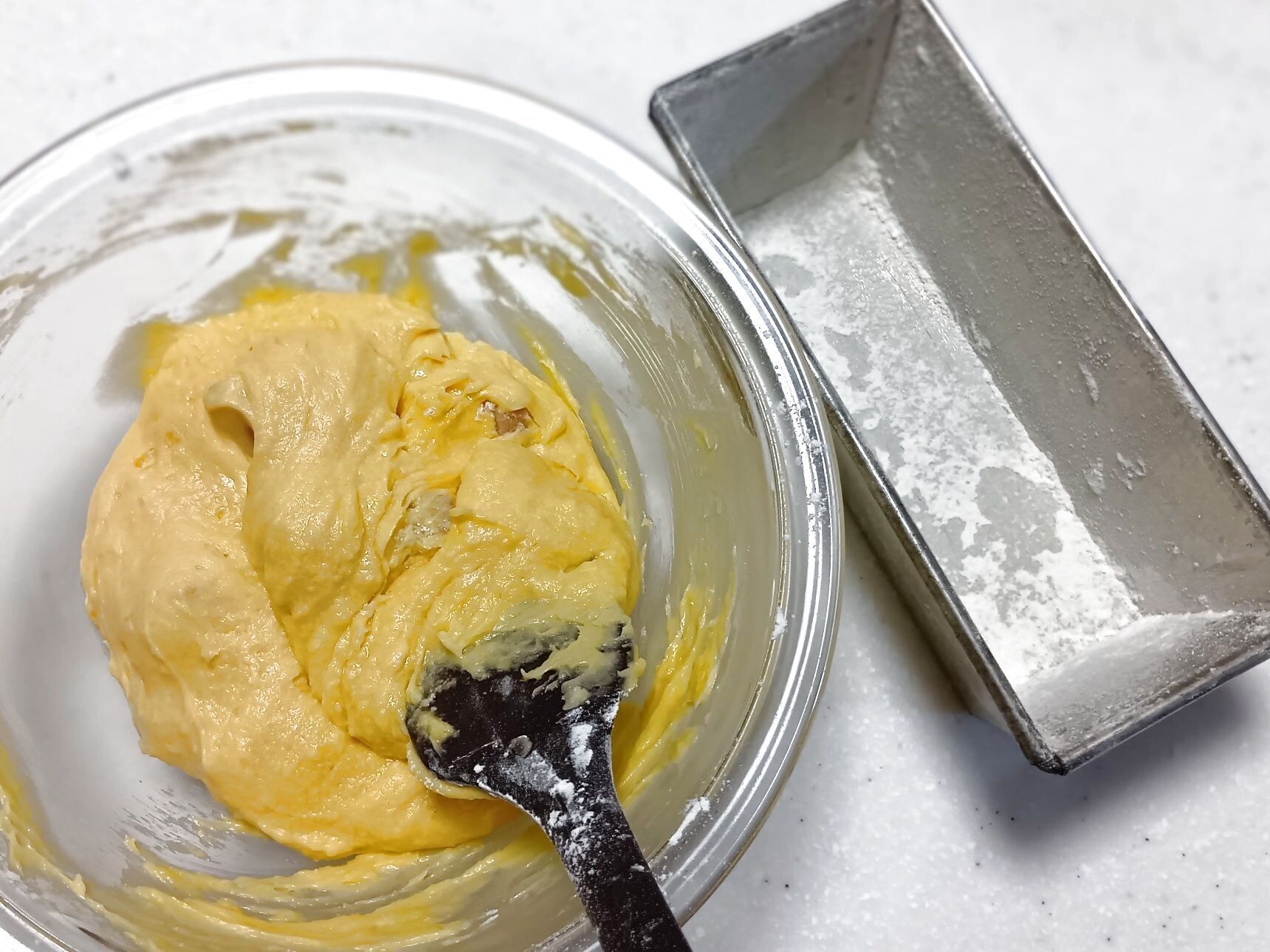 ④ バターを塗り、強力粉をはたいた18cm×7cmのパウンドケーキ型に生地を流し入れます。