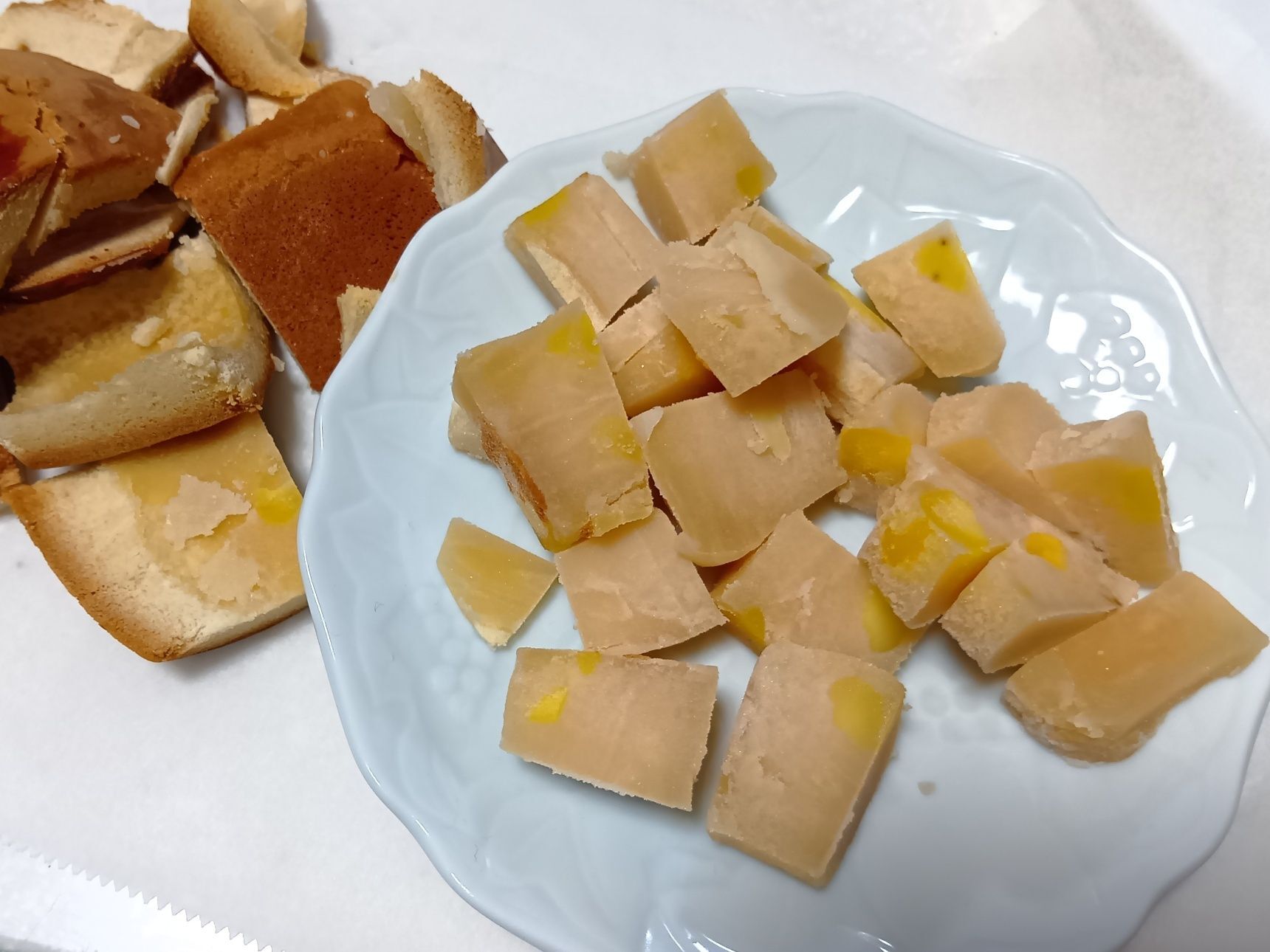少し前に頂いた和菓子は、一度に食べきれないので、そして、長期保存するために、食べやすい大きさにカットして冷凍保存していました。