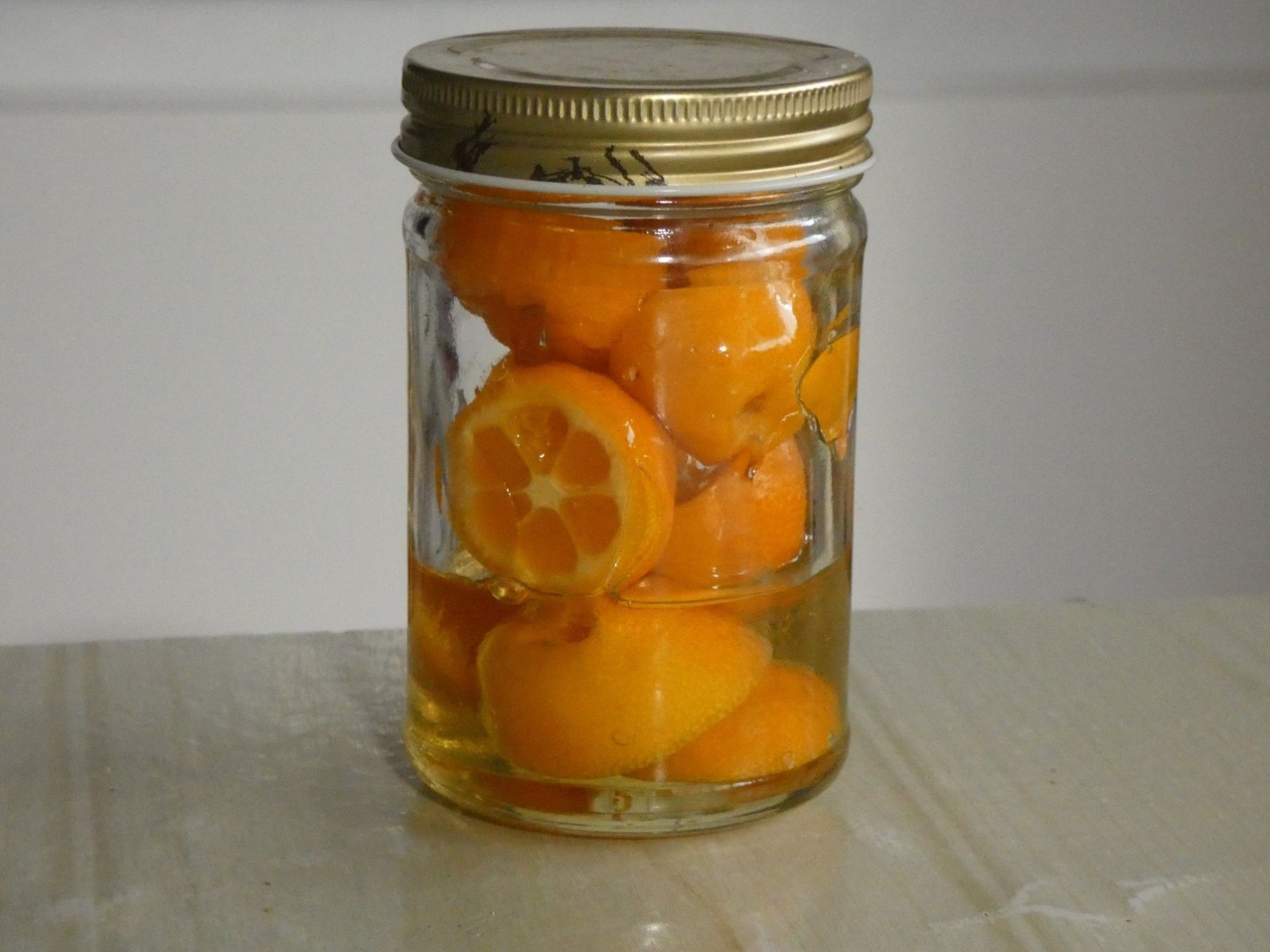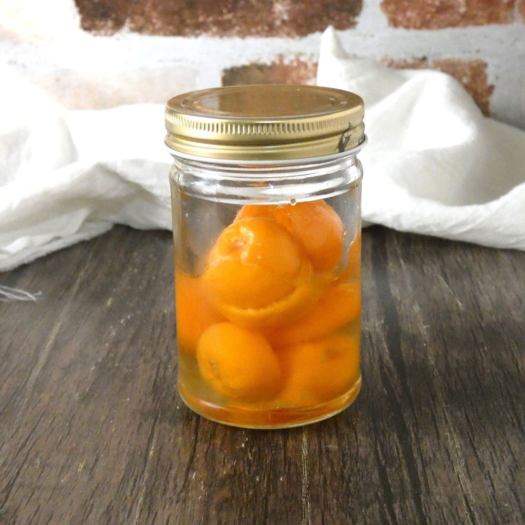 煮沸消毒したビンに金柑とはちみつを入れます。