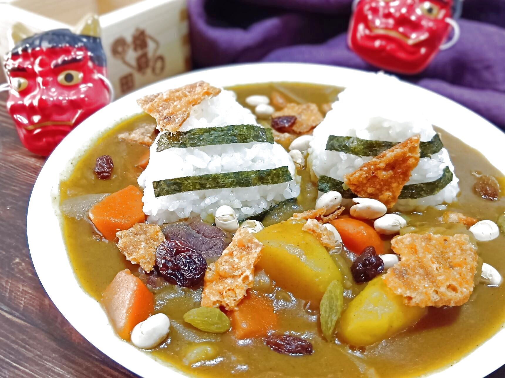 その上に③と節分の豆を目立つようにのせ、お好みでレーズンをトッピングします。