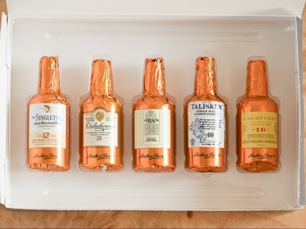 シングルトン、ダルウィニー、オーバン、タリスカー、ラガヴーリンの5種類の世界的に有名なシングルモルトスコッチウィスキーがチョコレートの中に入っています。