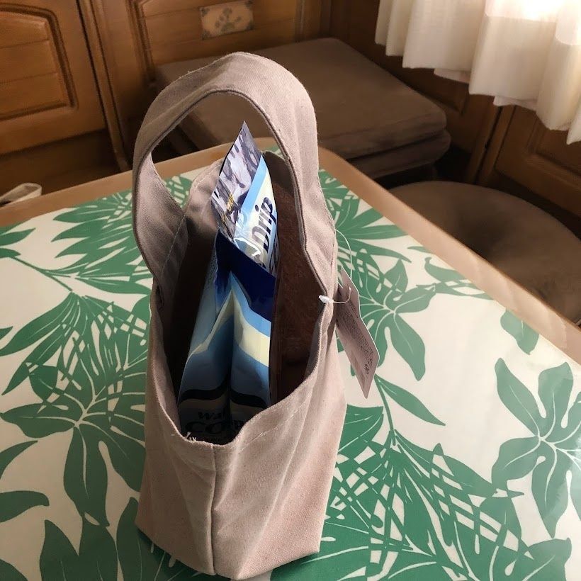 くるくるっと丸めて端を入れ込めばこんなに小さく丸め、畳むことができます。エコバッグとしてカバンに入れて持ち歩くことも可能です。