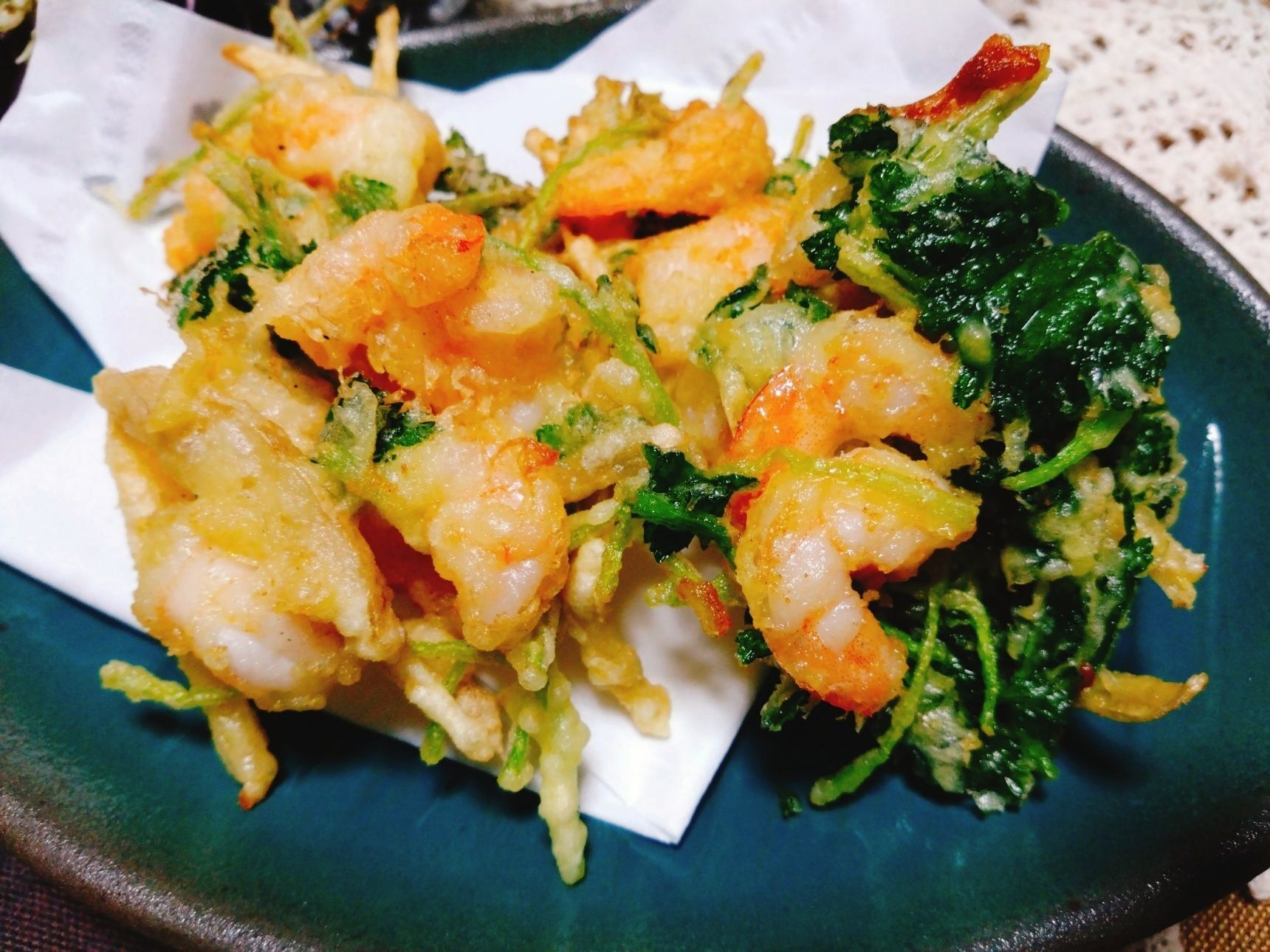 1.ボウルにエビ、生姜、三つ葉、てんぷら粉を入れて全体をよく混ぜたら、水を少しずつ加えてざっくり混ぜる。