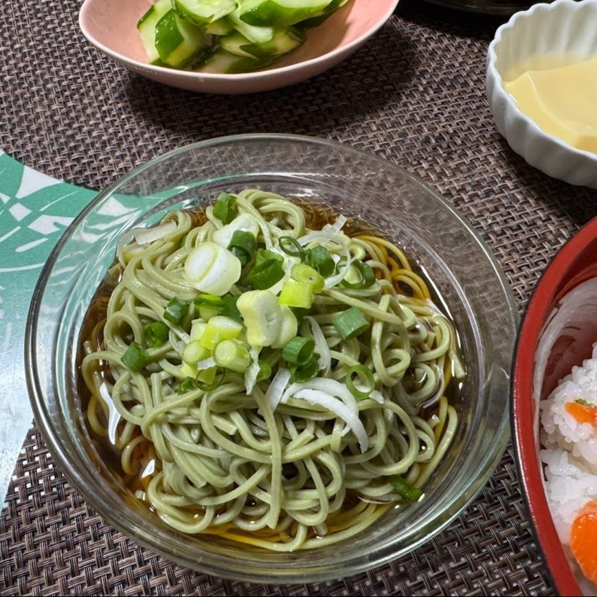 きれいな緑色の麺は喉越しが良くて、つるつるっと美味しいです。まさかこれが100均で買った物なんて夫は気が付いていません。それくらい美味しいのです。