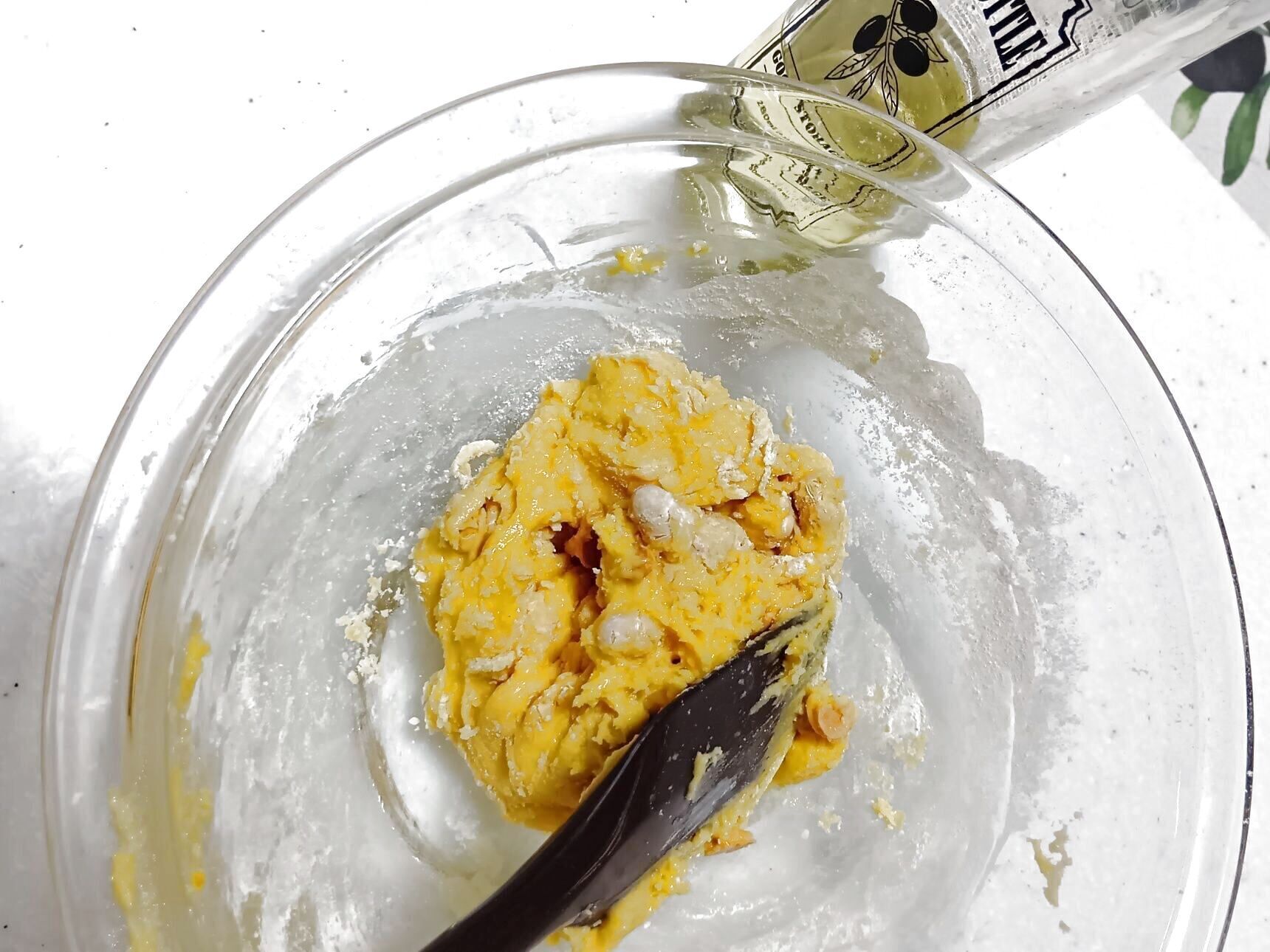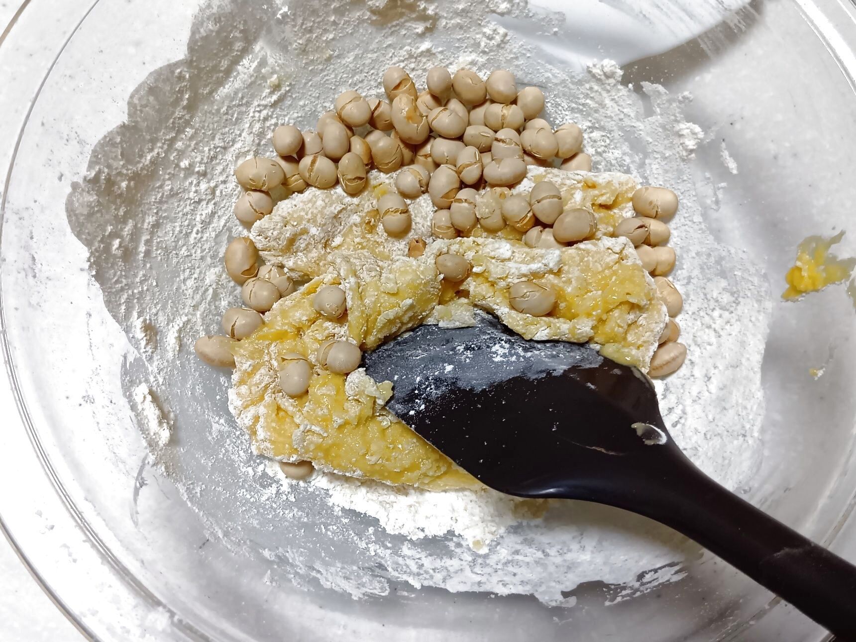 ②粉けが少し残った状態で、①に福豆を加え、混ぜ合わせる。