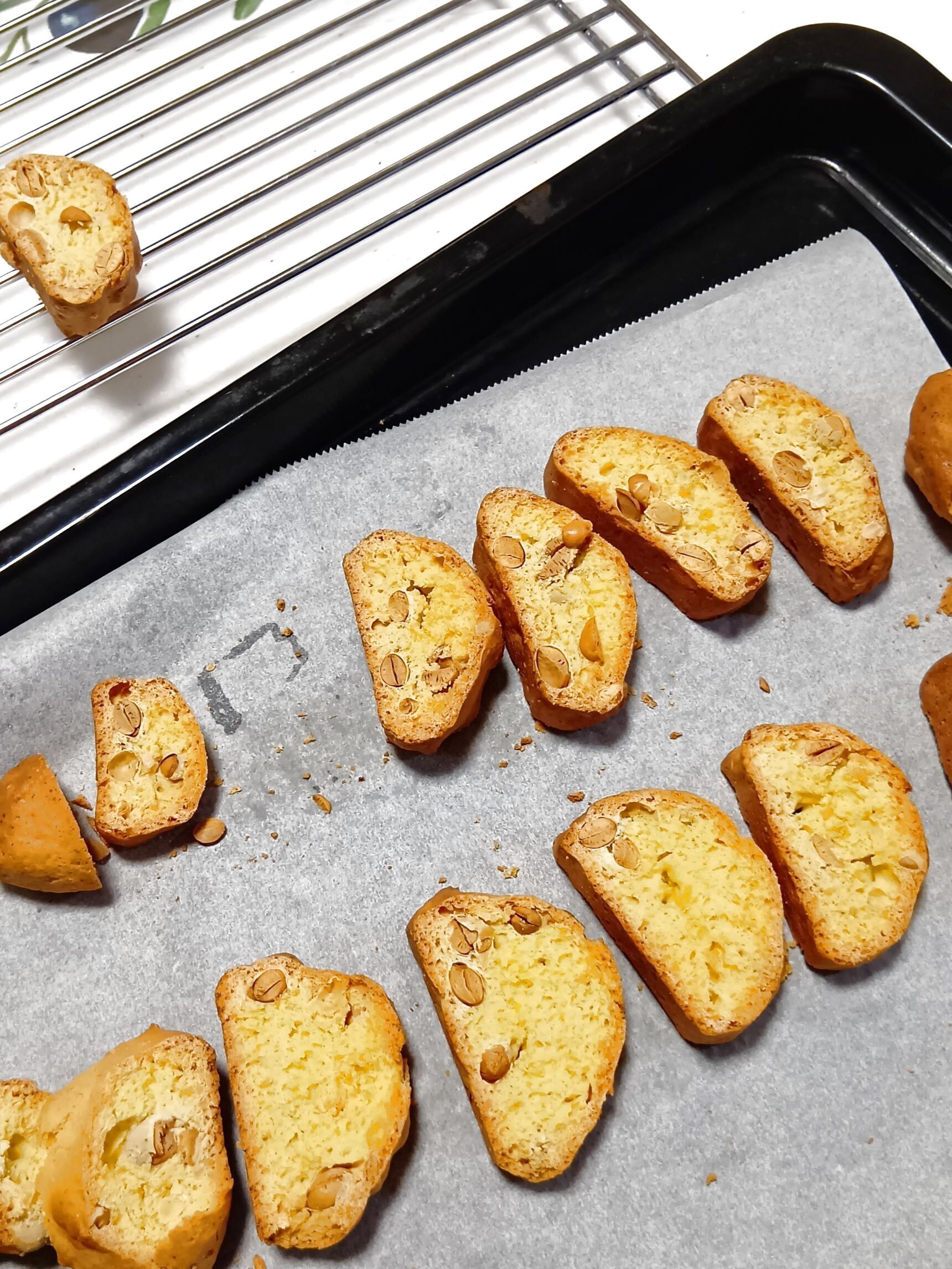 ⑥天板に並べ、オーブンの温度を160度に下げて5分焼く。上下を返し、裏面もさらに5分焼く。こうすることで、固焼きのビスケットに仕上がる。焼き上がったらケーキクーラーにのせ、しっかり乾燥させる。