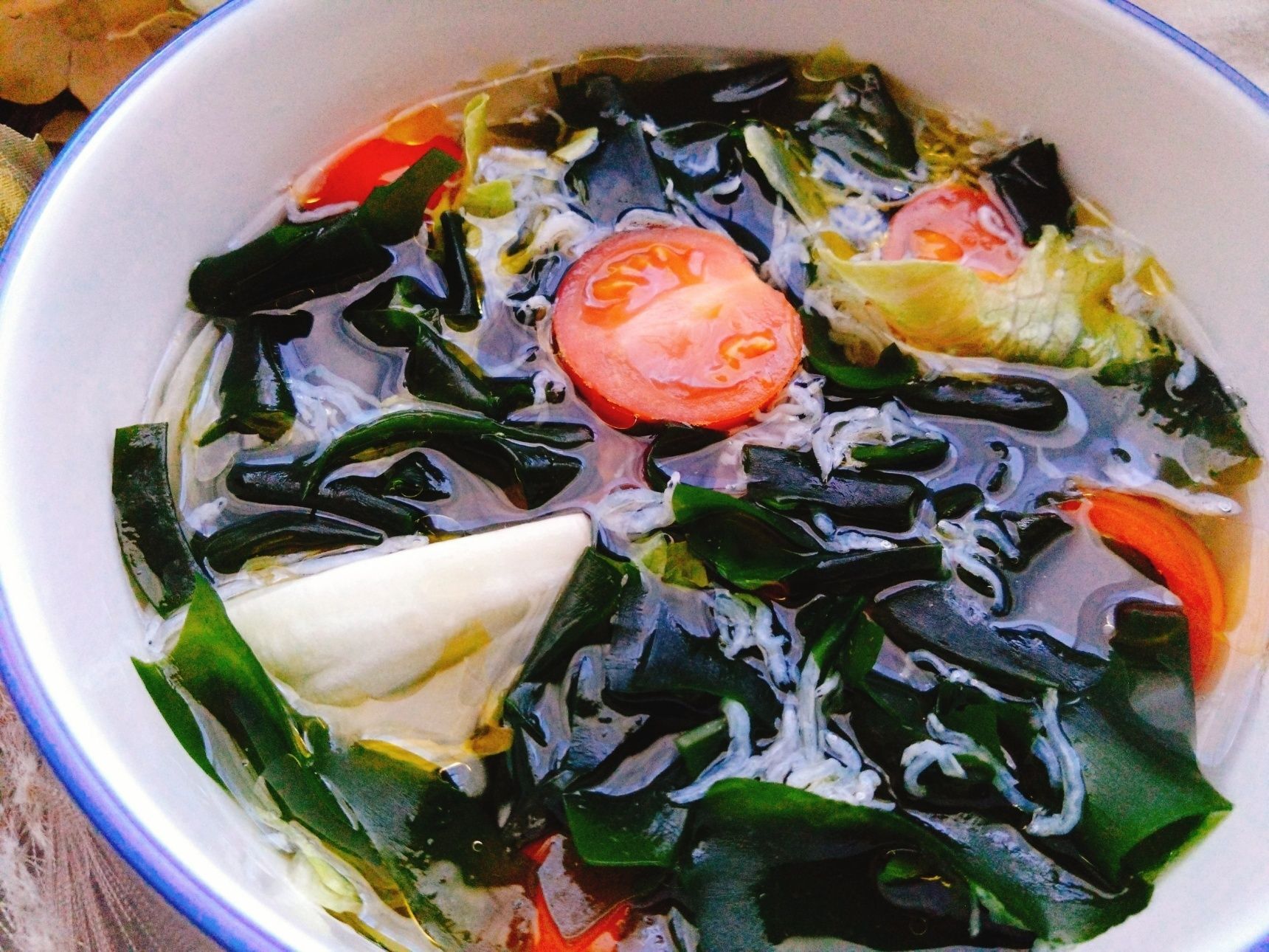 1.鍋にA、ミニトマトを入れて中火にかけ、沸騰したらレタス、わかめを入れてサッと煮て、塩で味を整える。