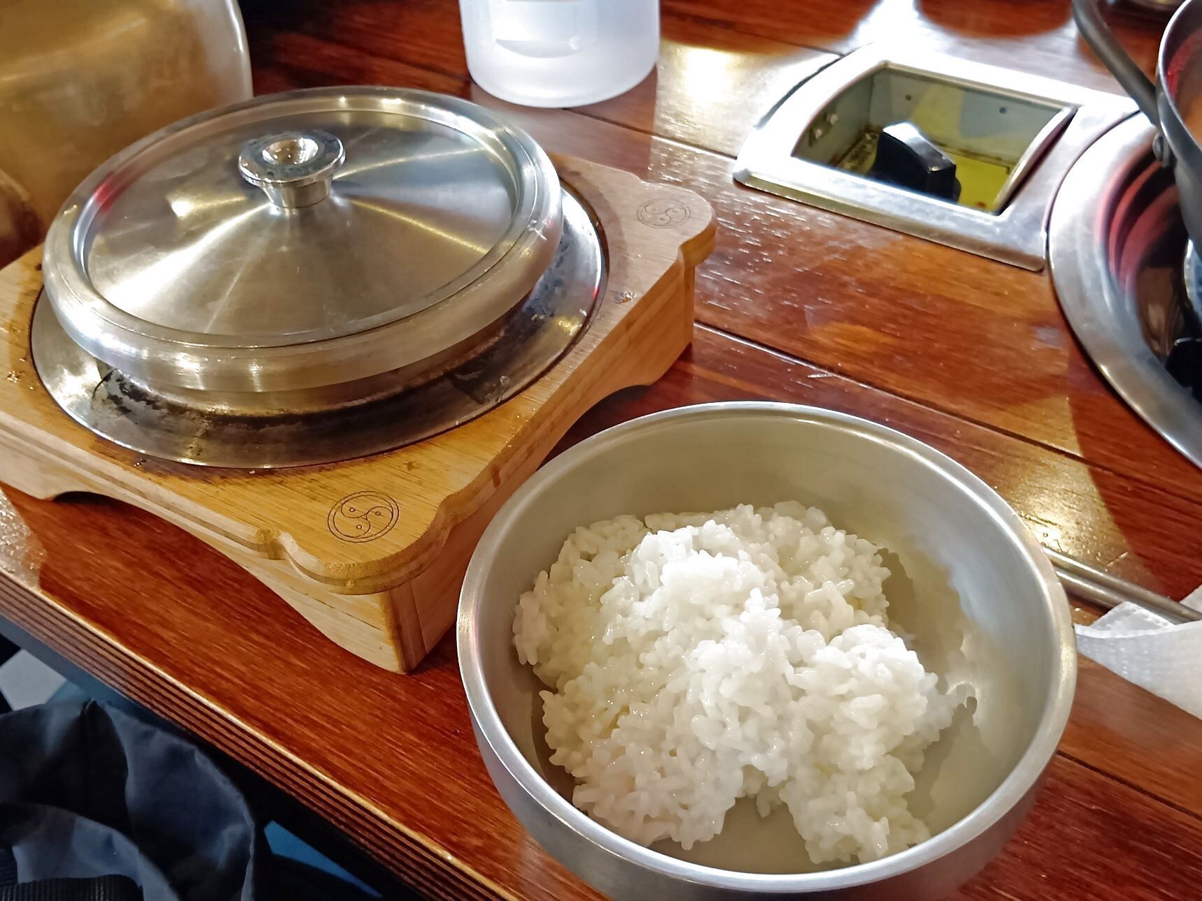 おこげがついたご飯を器に移し、お茶(コーン茶)を注いでいただくスタイル。