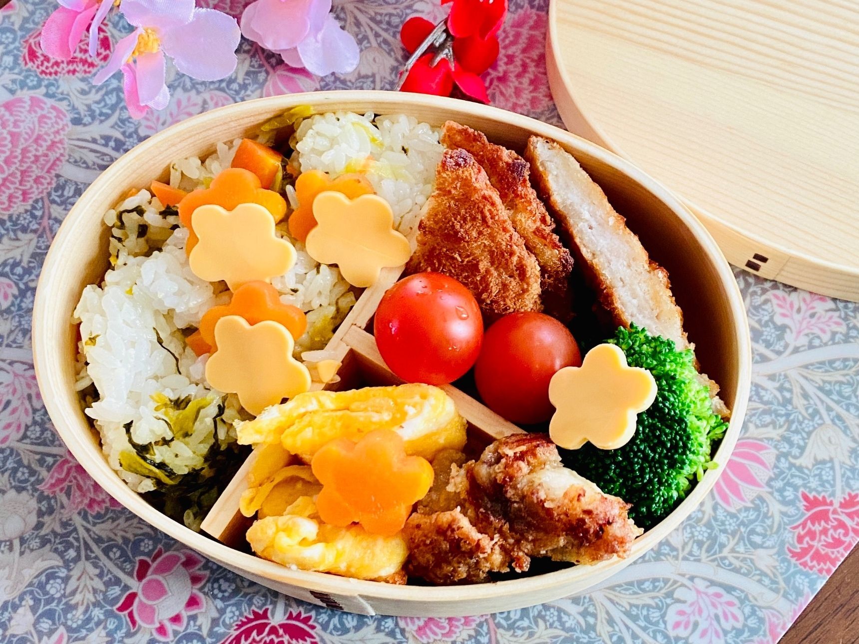 温かいご飯に、ごま油と高菜漬けを混ぜてお弁当に詰めます。 おかずには、とんかつ、唐揚げ、卵焼きなどを詰めました。 トマトや塩茹でしたブロッコリーで彩よく詰めました。