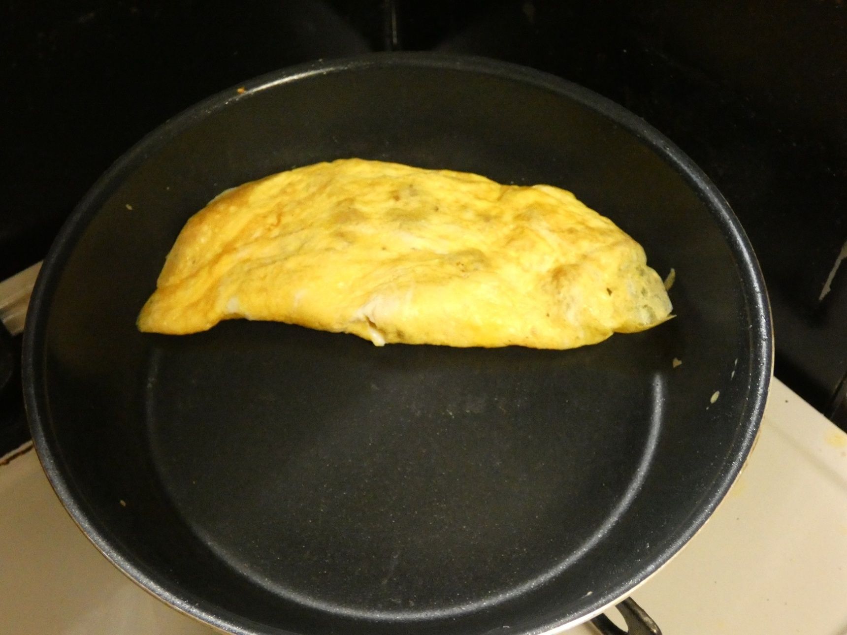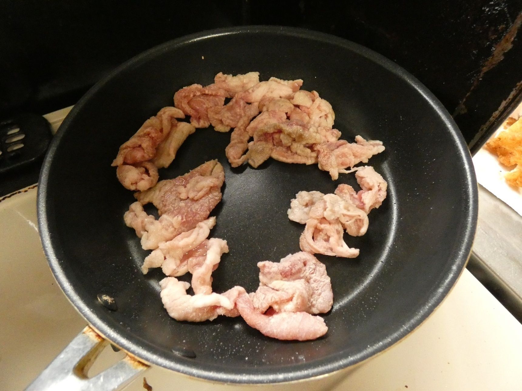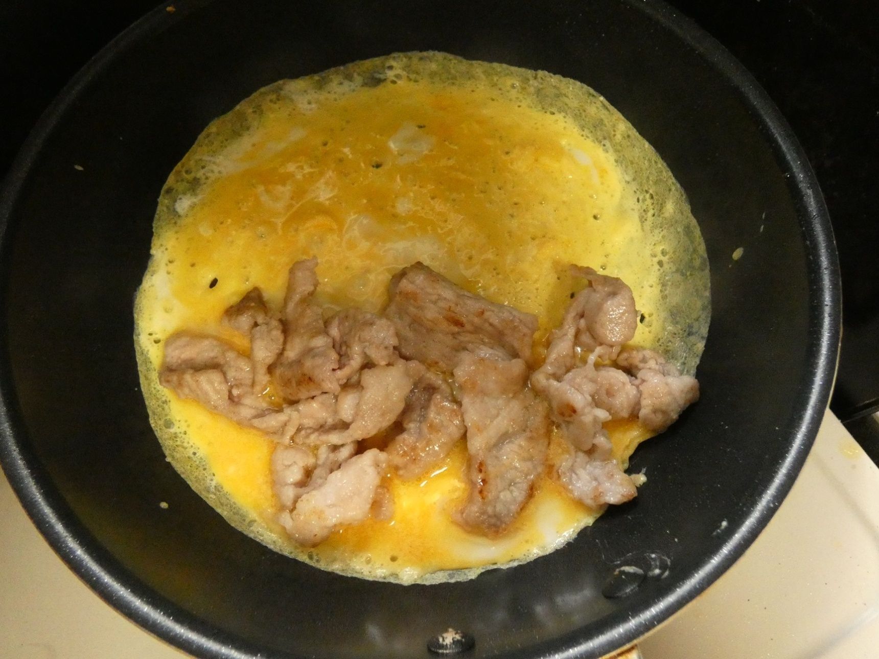 豚こま肉の半量を乗せ、卵をかぶせるように包みます。
