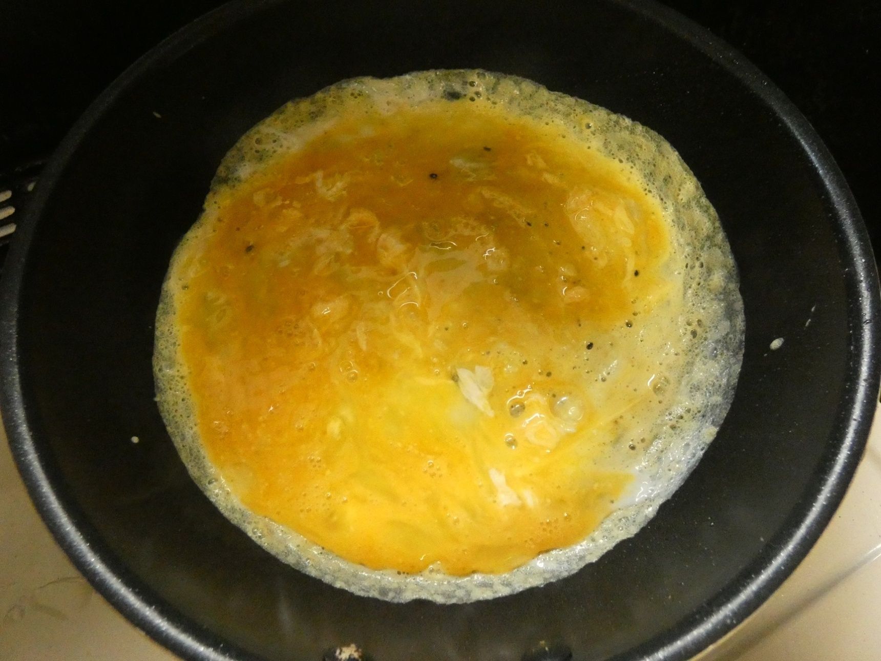 卵を溶いてAを混ぜ合わせます。油をひいたフライパンに半量を薄く広げます。
