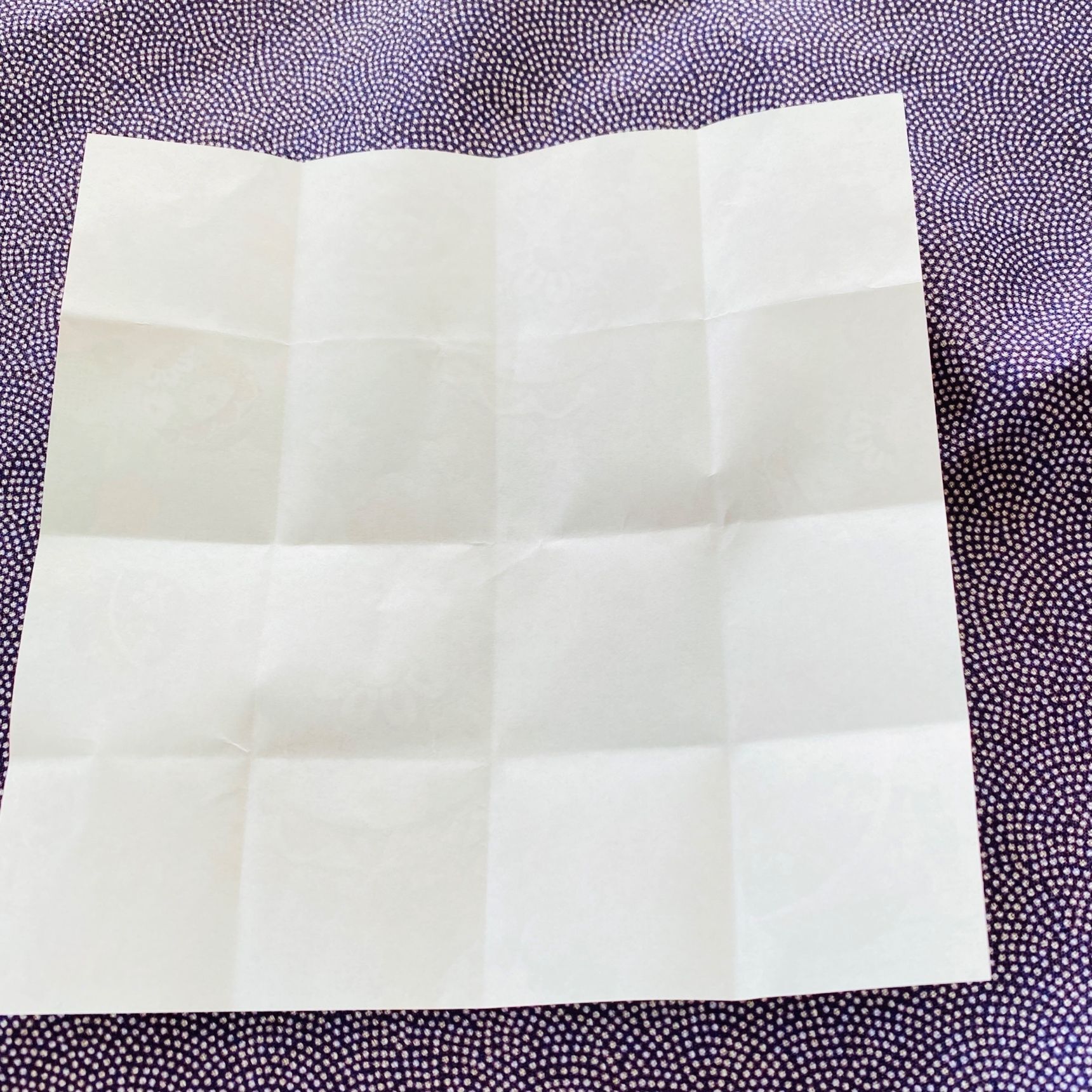 折り紙を縦横2回ずつ折って折り目をつけて開きます。