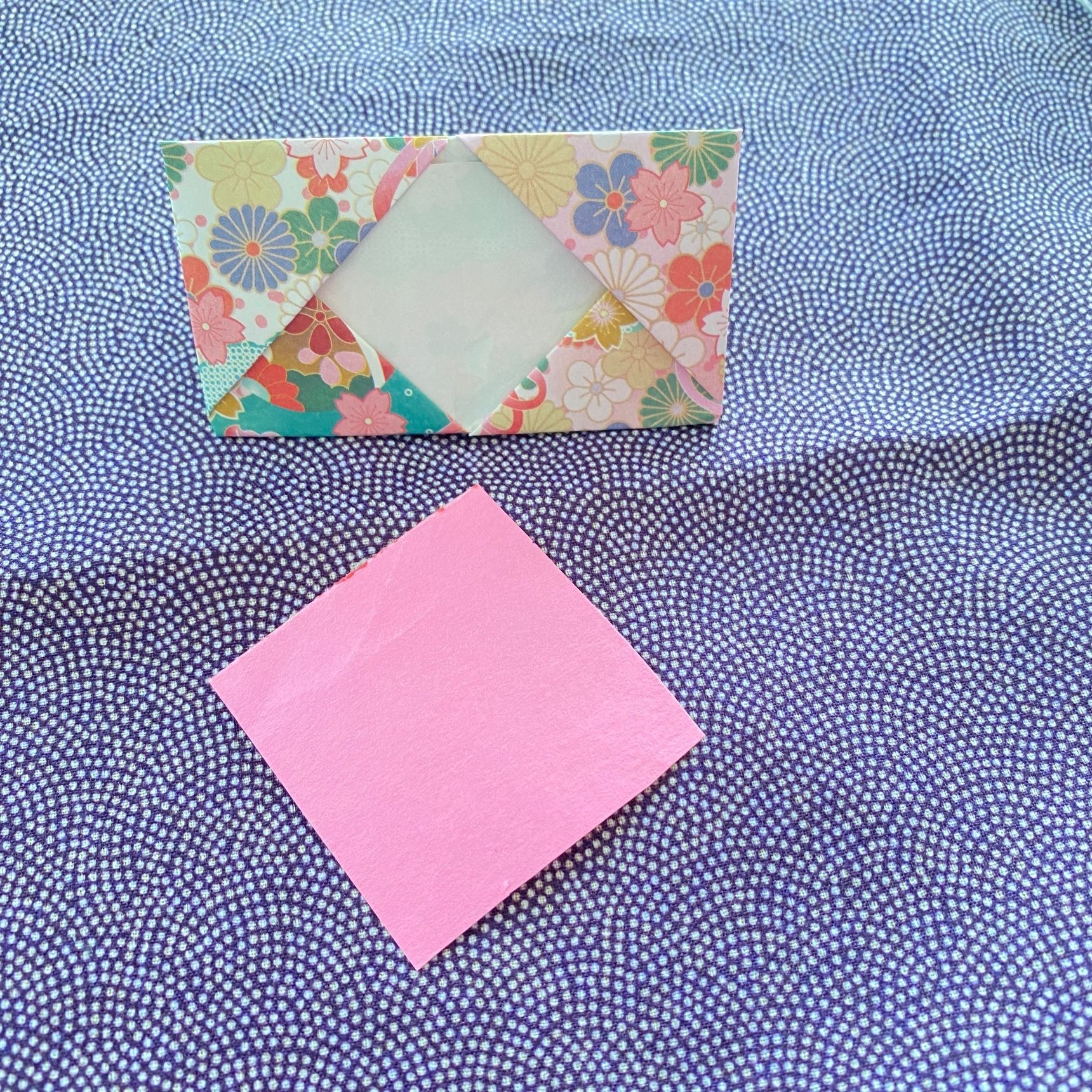 白い菱形より一回り大きくカットした折り紙を差し込んでいきます。