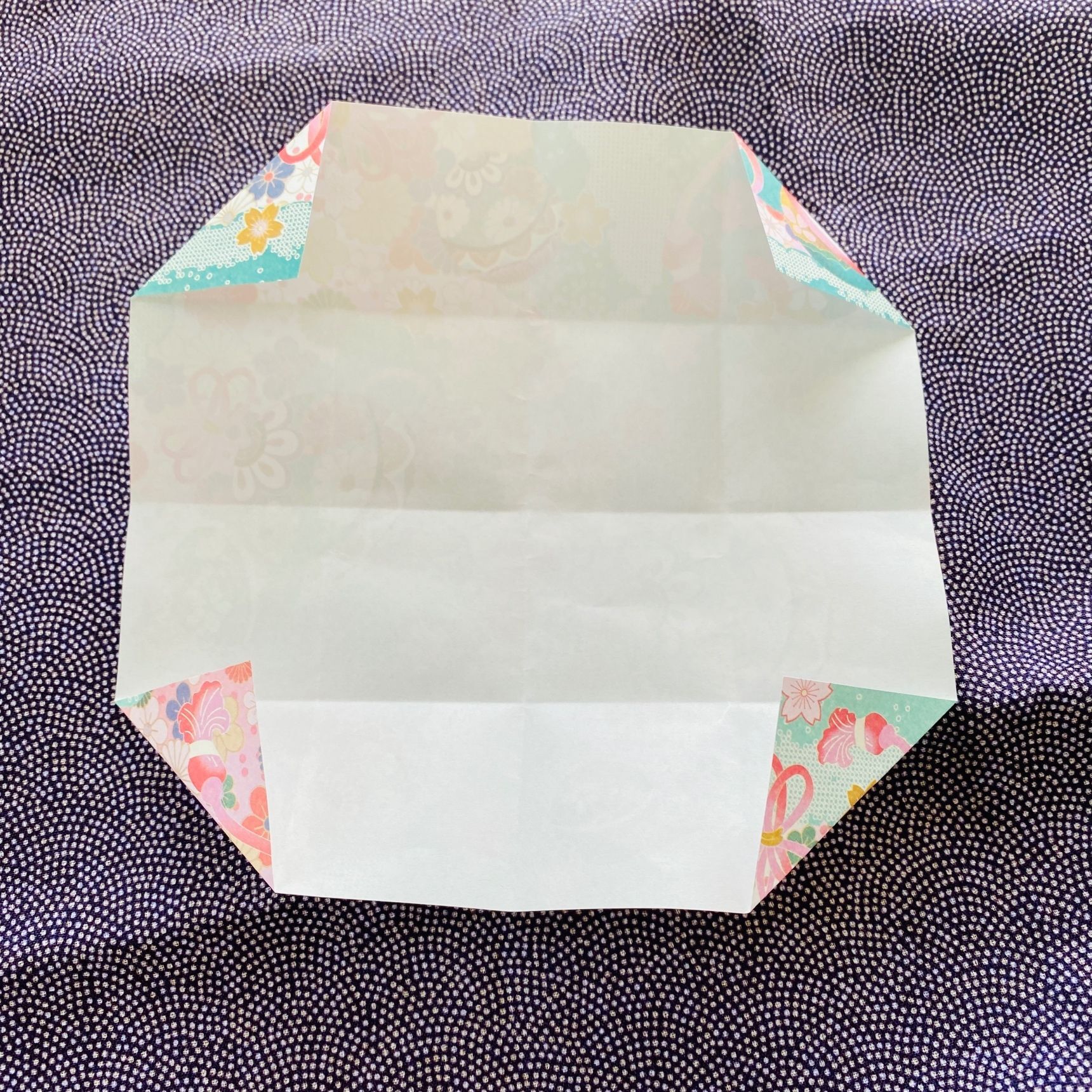 四角の端を写真のように三角に折ります。