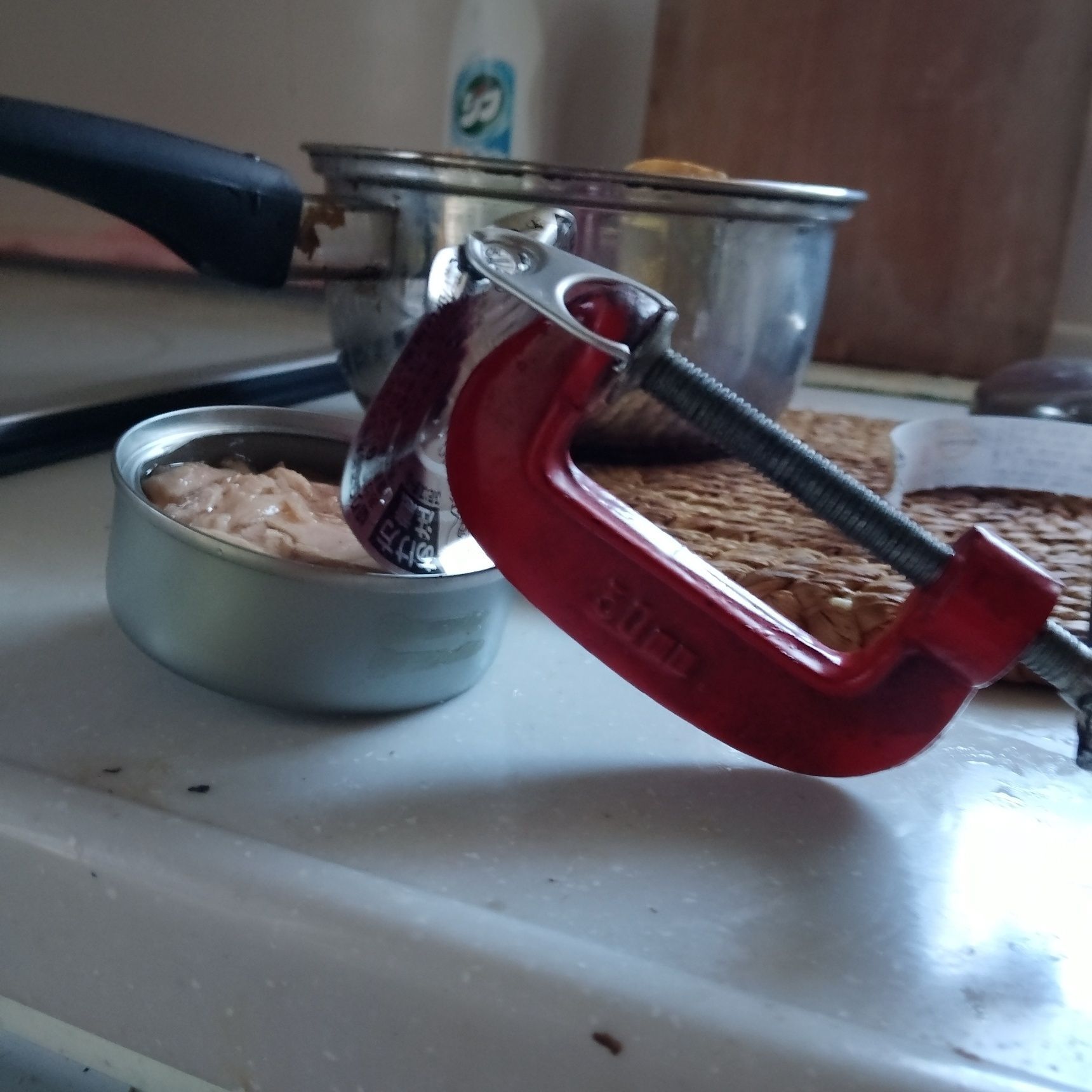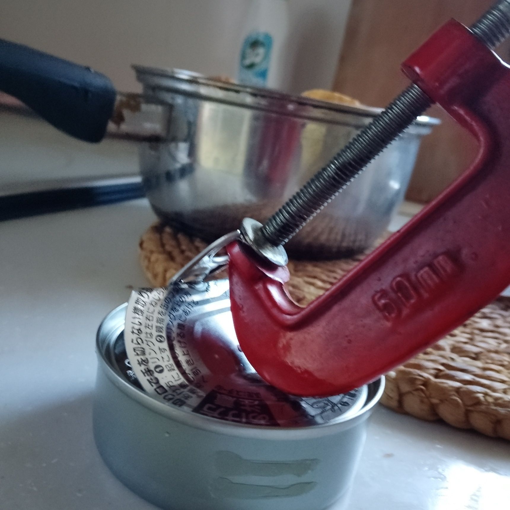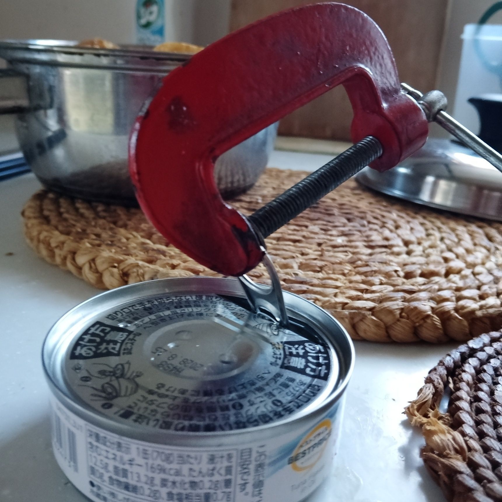 蓋で手元を切らないように気を付けてください。テコの原理で楽に開きます。 万力の本体(赤いところ)を握ると安全。