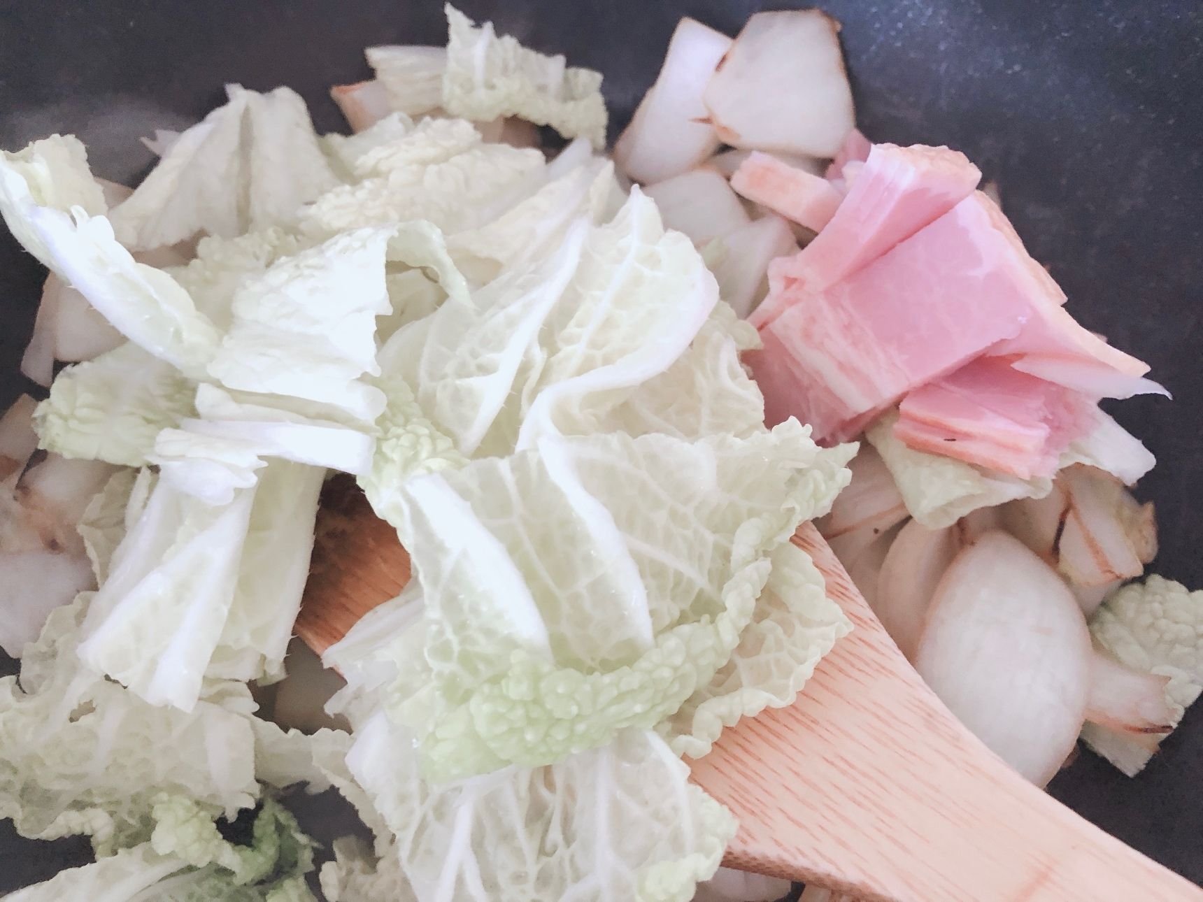深型のフライパンに玉ねぎと白菜の芯を炒め、しんなりしてきたら白菜の葉、ベーコン、バターを加えて炒めます。