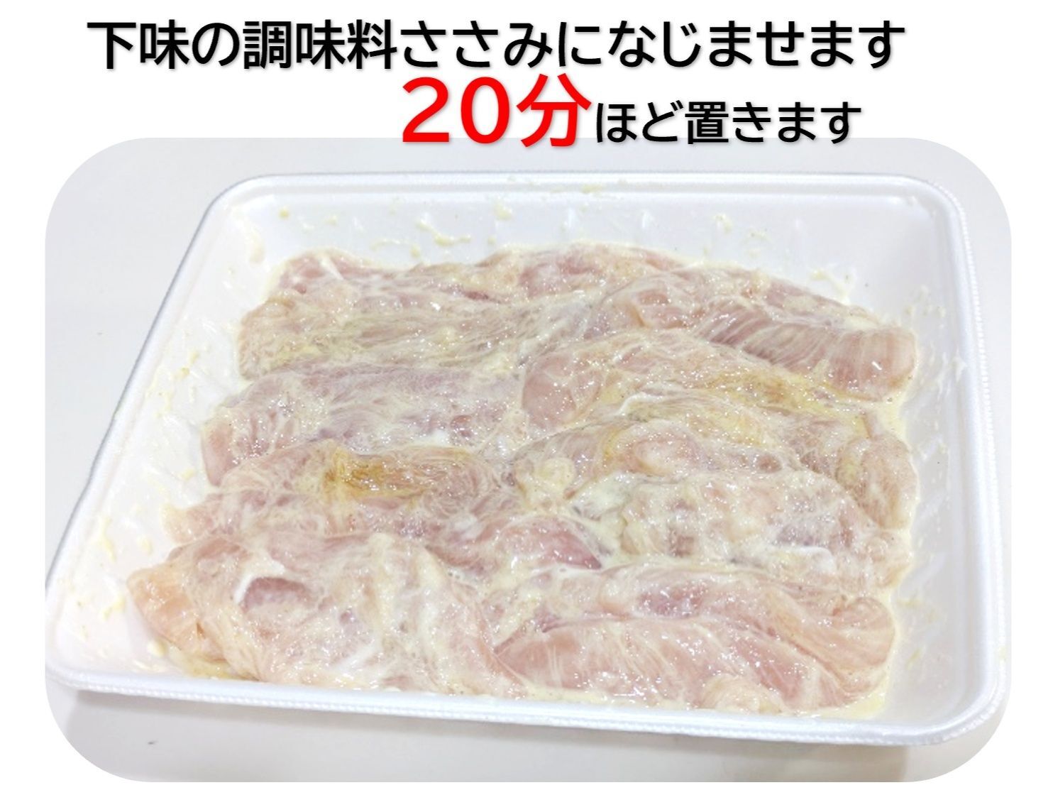 ささみはスジを取り、包丁で開いて平たくし、フォークでブスブス刺します。【下味調味料】