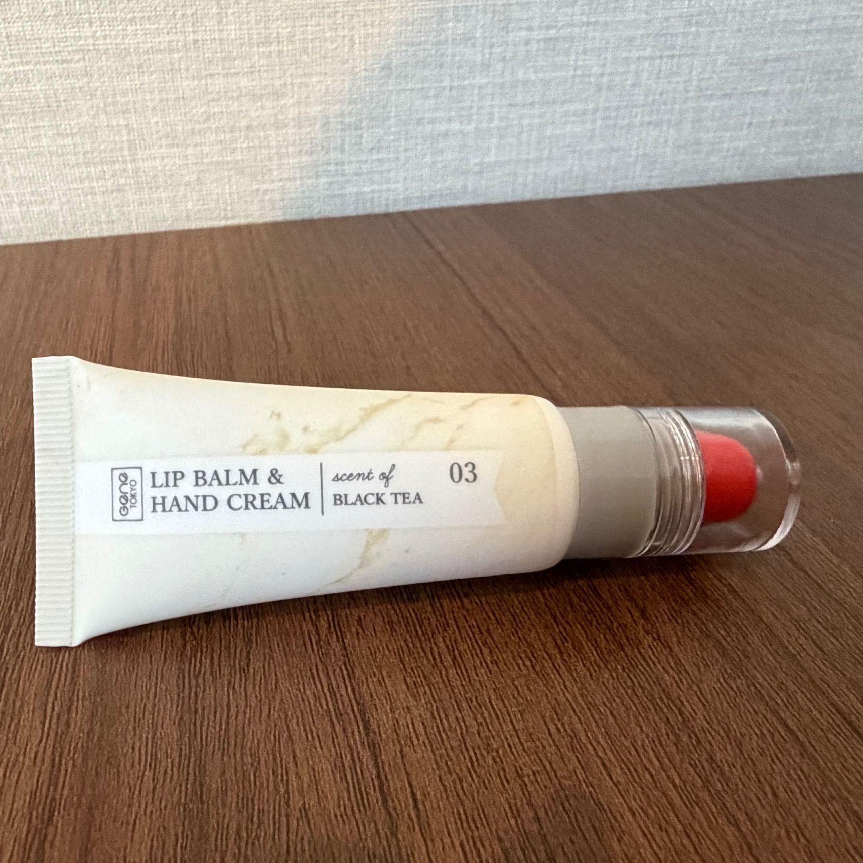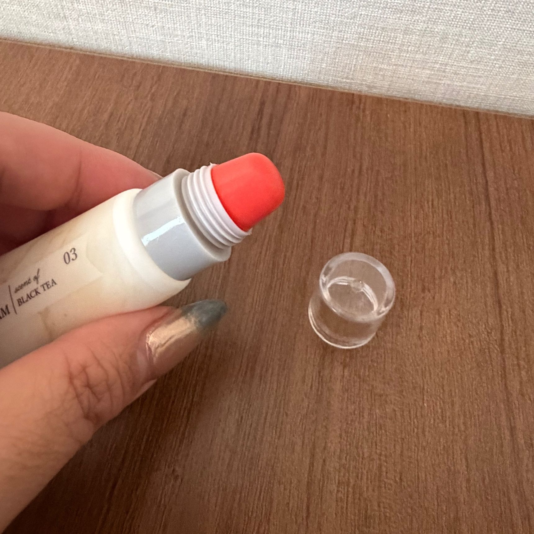 私はオレンジ系のリップが欲しかったので、ブラックティーの香りがセットになった03番を選びました。ちなみに、5、6回塗り重ねても薄付きです。