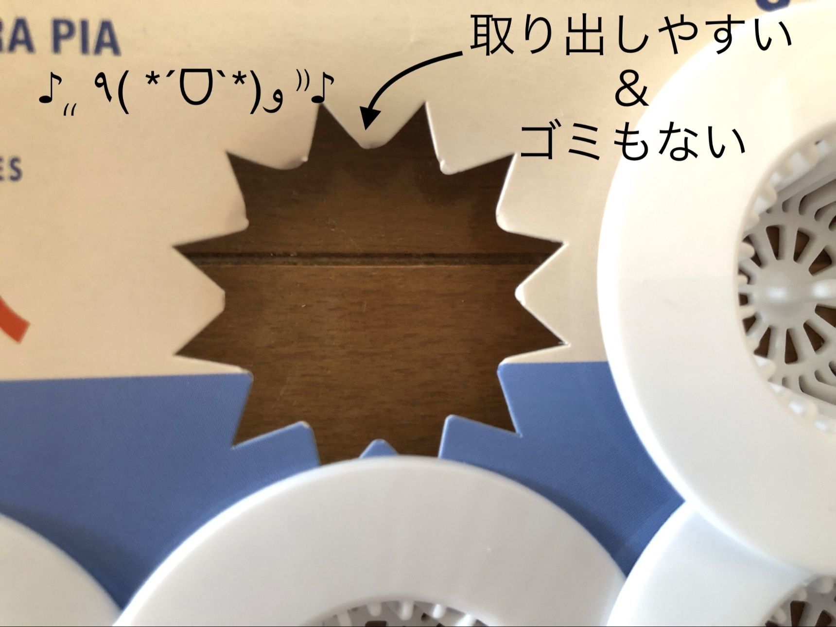 以前まで使っていた類似商品はテープで1つ1つが固定されていたのですが、これが何かと厄介でした。取り出す時にもたつく上に、最後の1つを取り出した後の分別もなかなか大変でした。テープが台紙に張り付いていてうまく取れないんです。(私が不器用なだけかもしれませんが…)