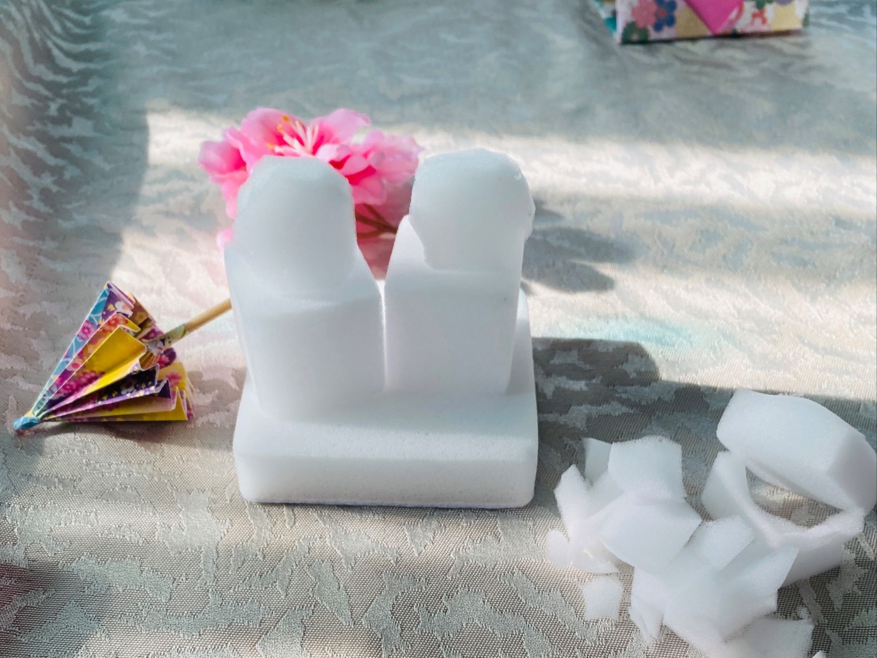 頭になるキューブスポンジを顔の幅、輪郭に気をつけて、少しずつカットします。