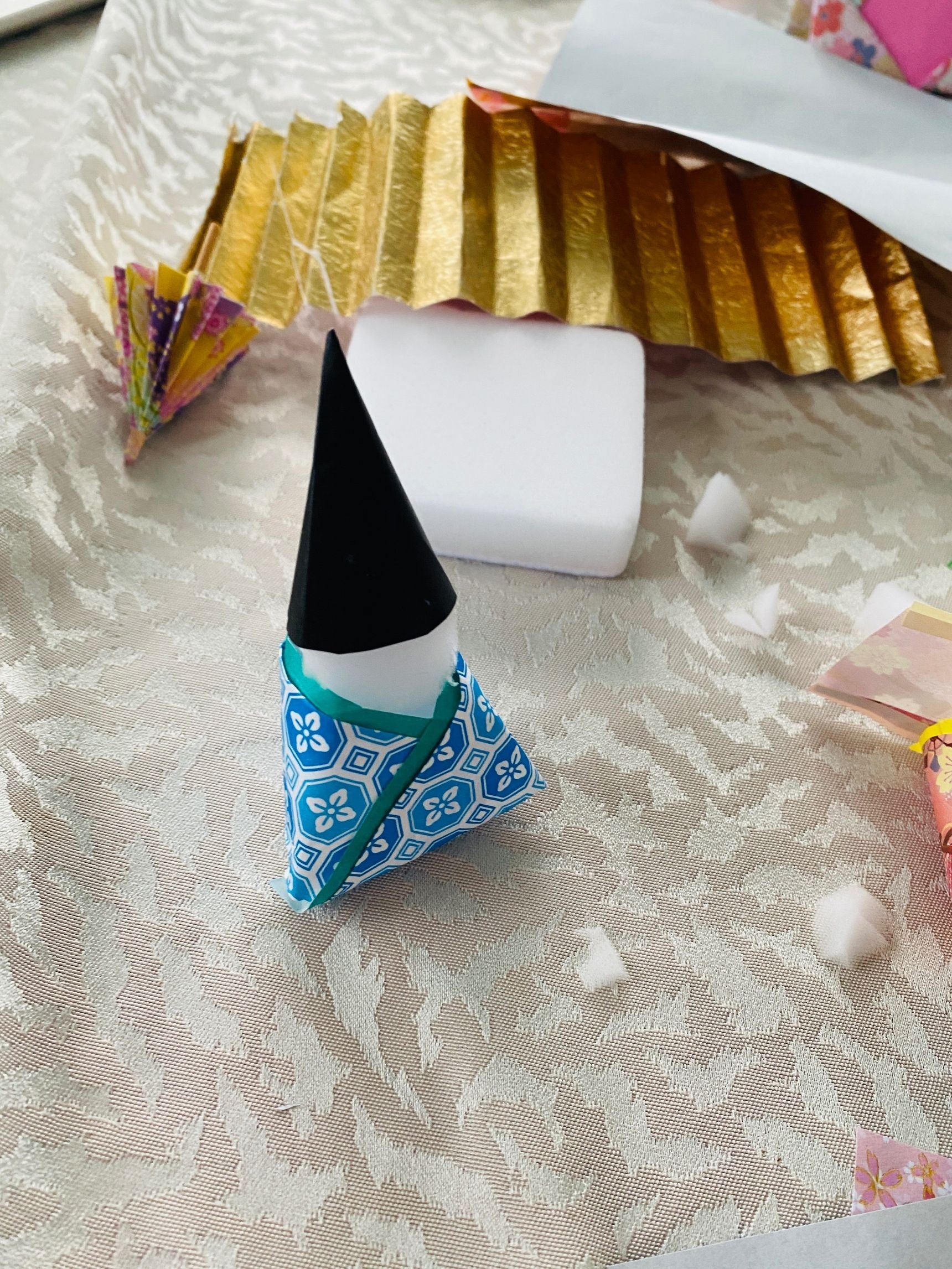 お内裏様の烏帽子は三角帽子を作り被せます。