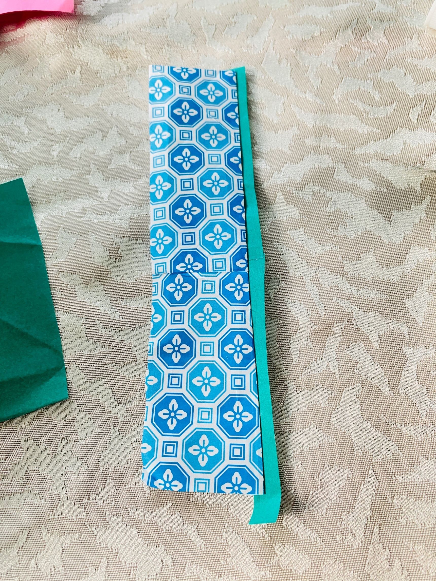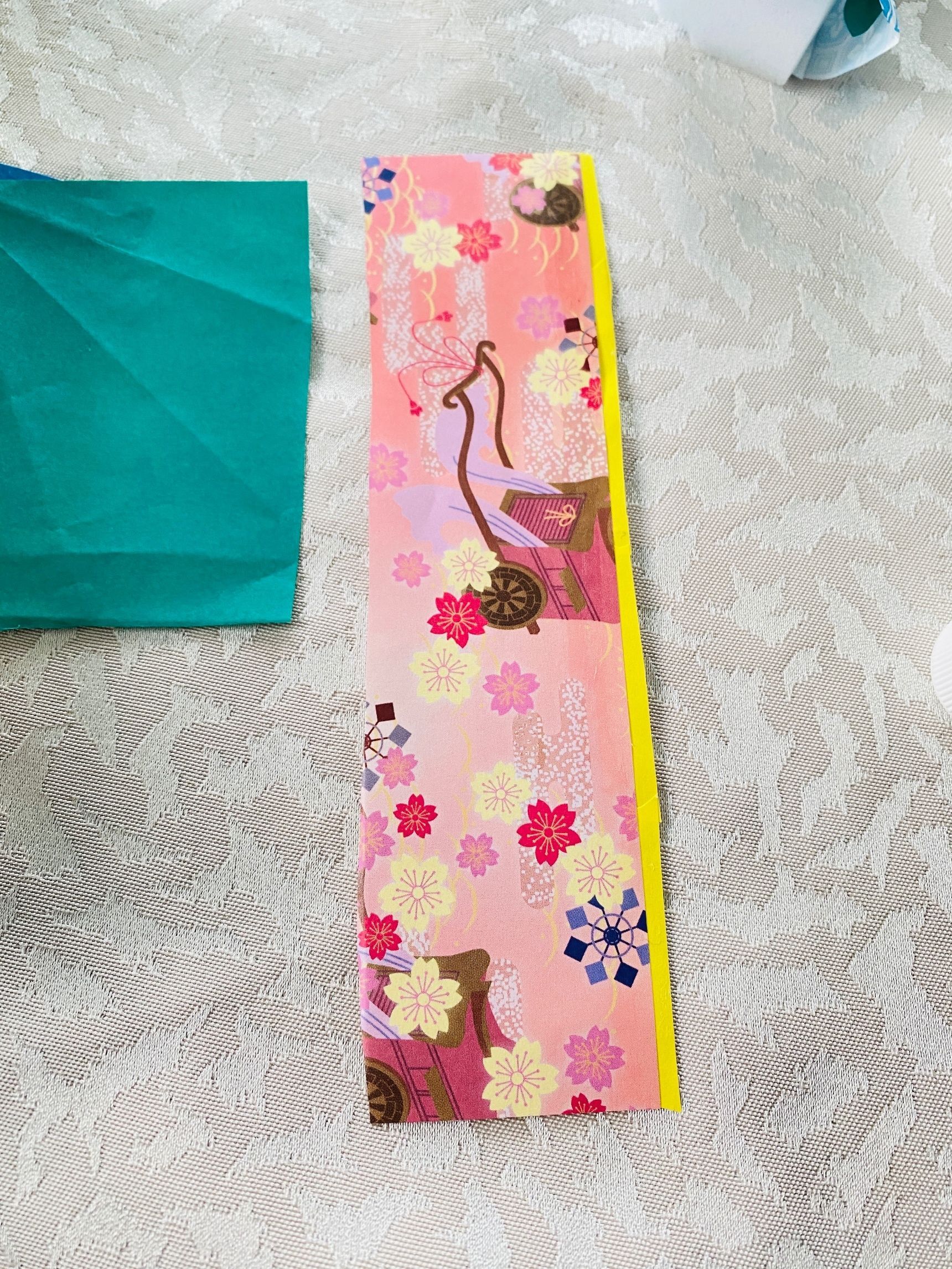 折り紙の柄に大きな花柄があったので、切り抜きして花飾り代わりにのりで貼りました。