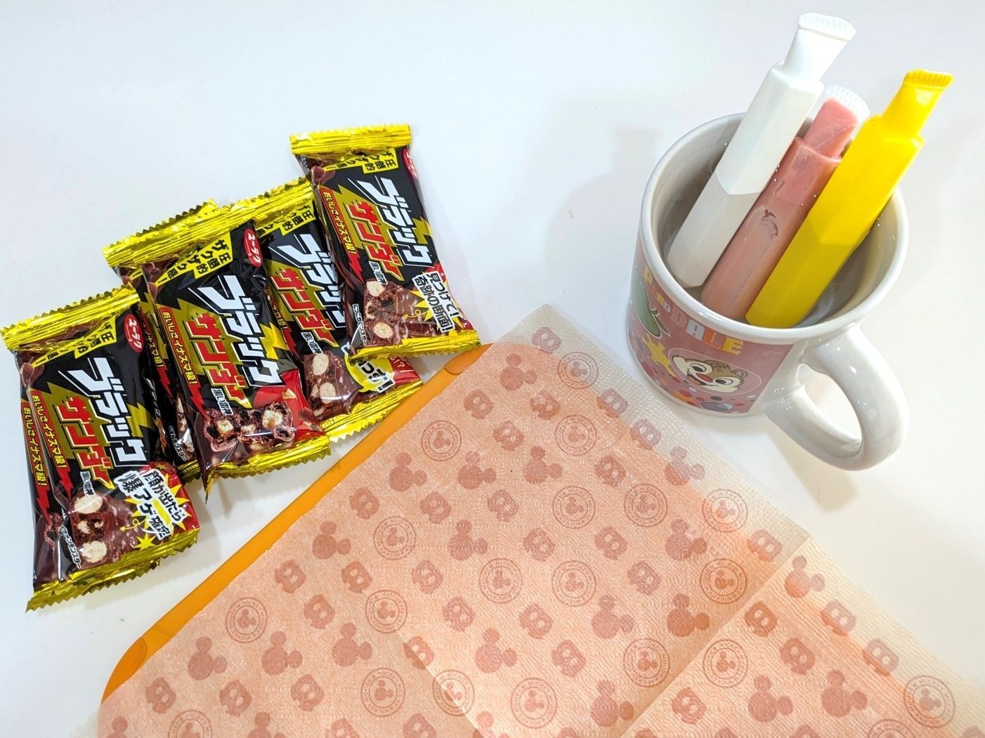 ブラックサンダーとチョコレートペン(黄・赤・白)を用意。※チョコレートペンはダイソーで購入しました。
