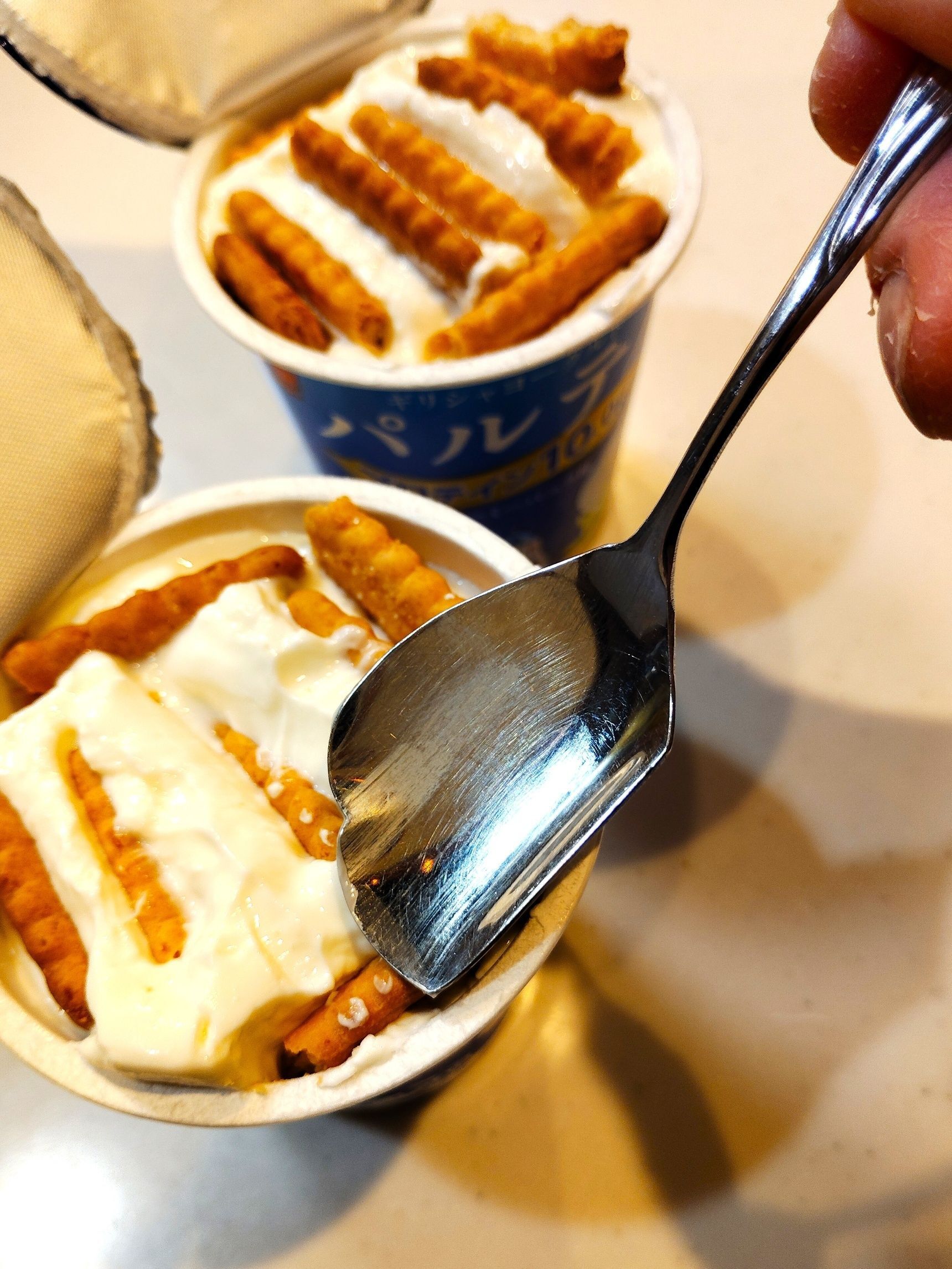 ヨーグルトのフタをあけ、サブレを半分にカットして、差し込んでいく。
