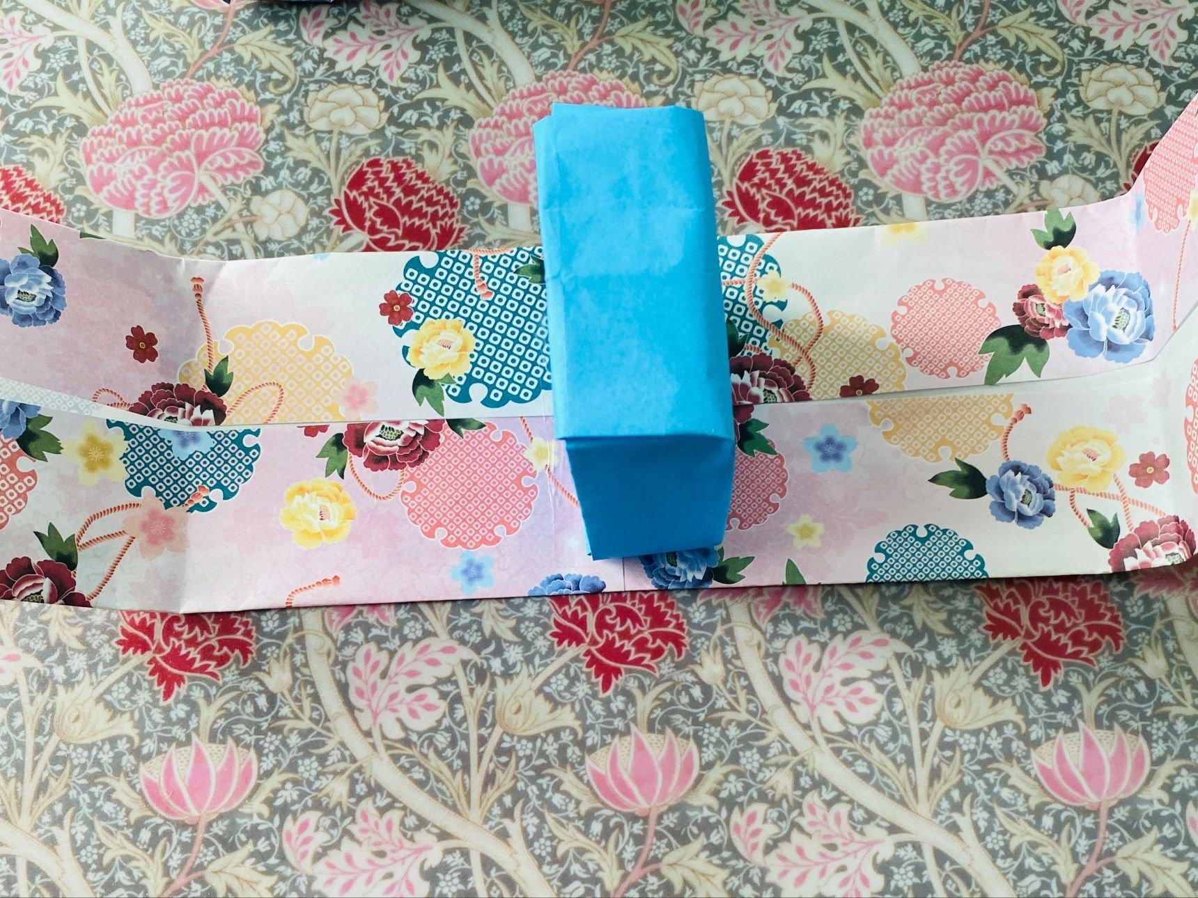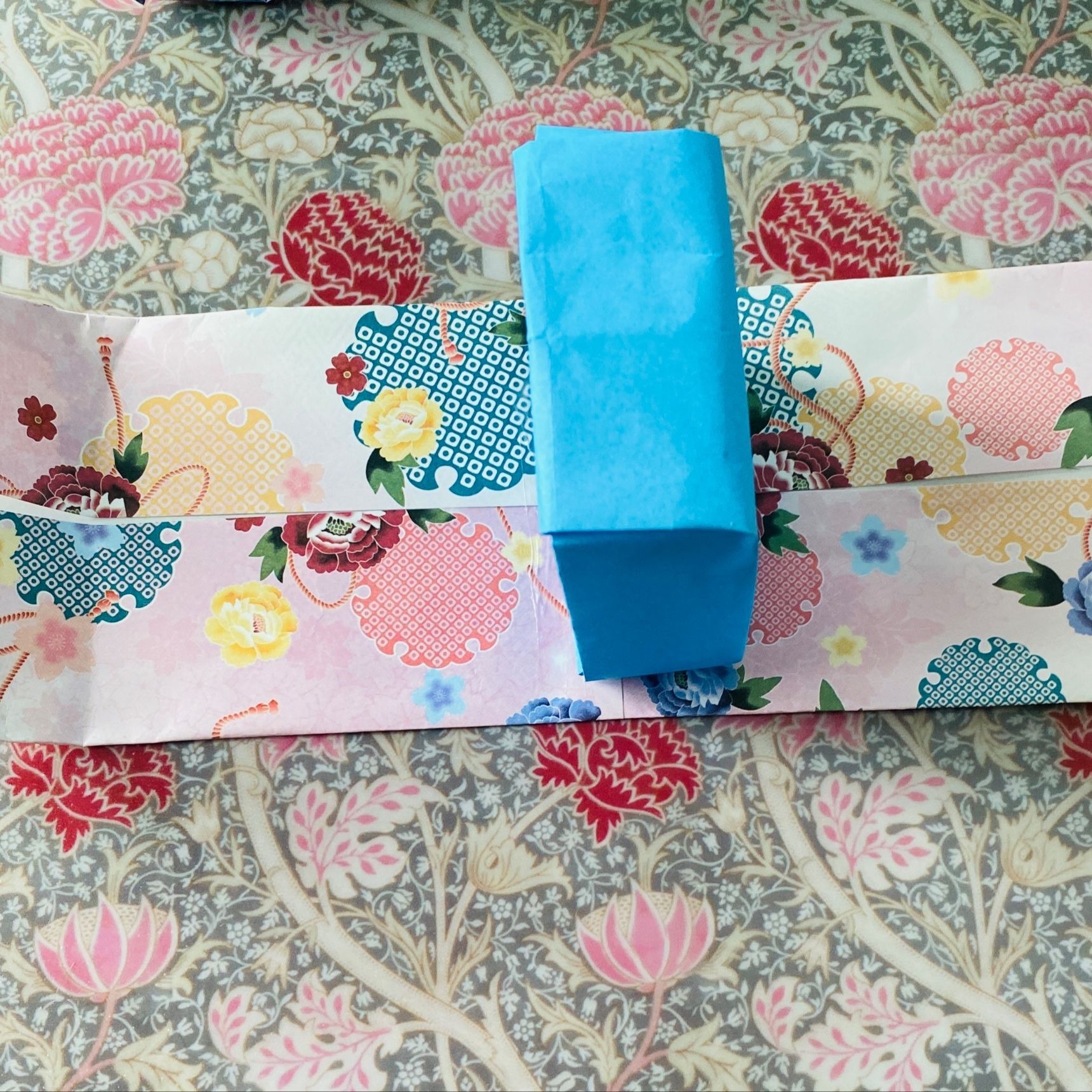 ③真ん中にのりをつけて留めます。同じように反対側を両端をつまんで三角折で隠すようにします。