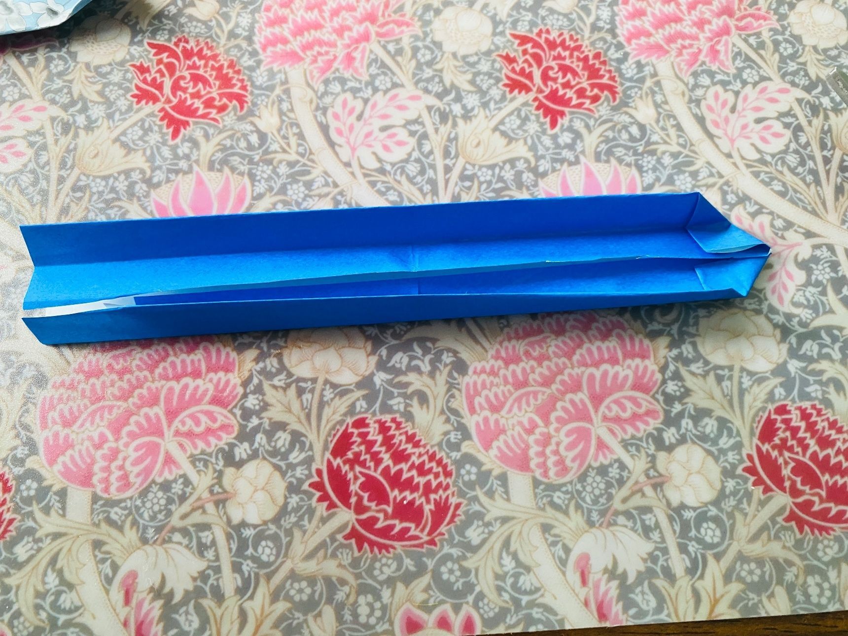 ⑧幅2cm、横5cmぐらいの折り紙を細く畳んで、端を少し折って、閉じベルトの差し込みができるように、のりでしっかりと留めます。