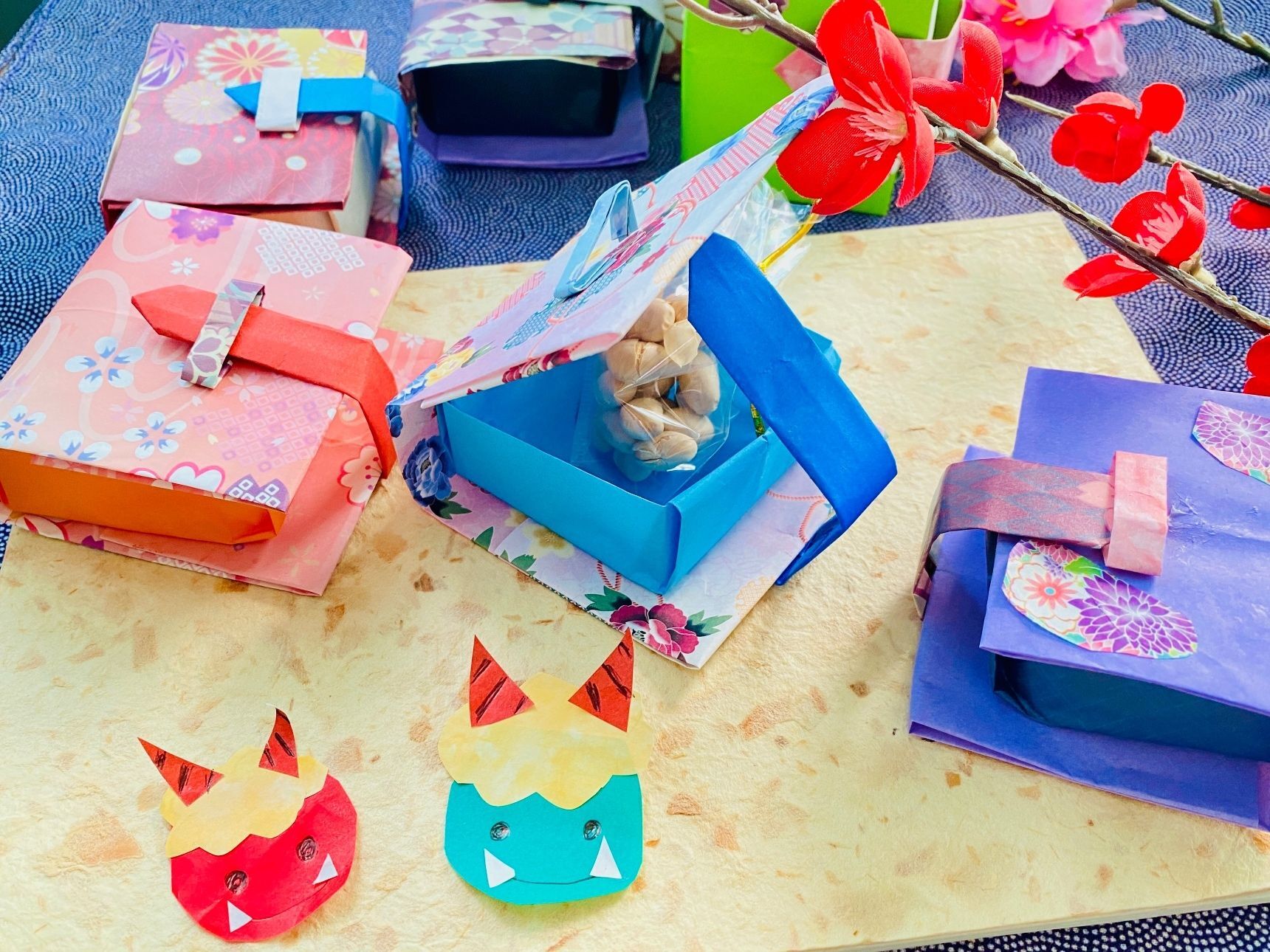 ⑨小袋に福豆を入れて閉じ紐で留めて、ケースに入れて、閉じベルトをして完成!