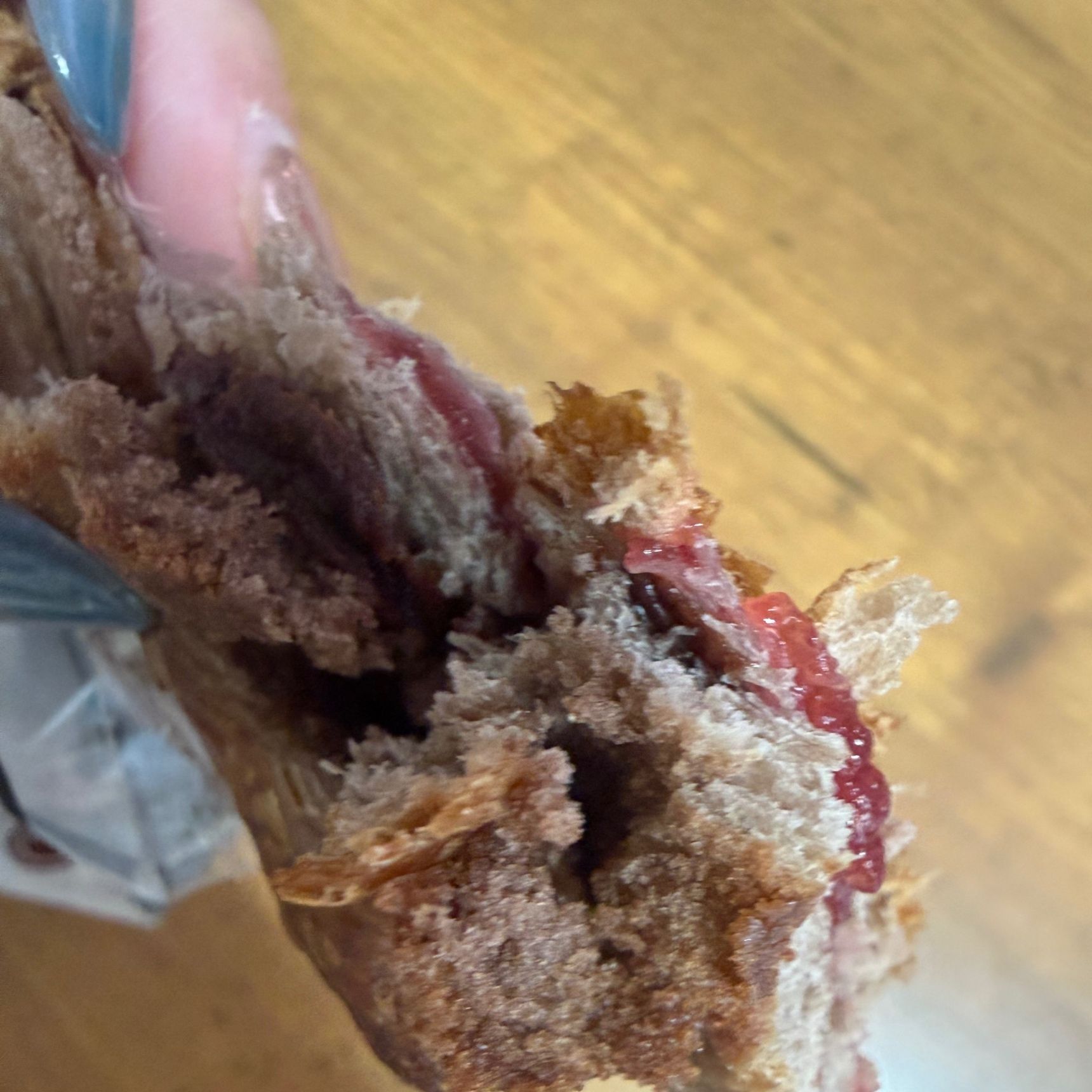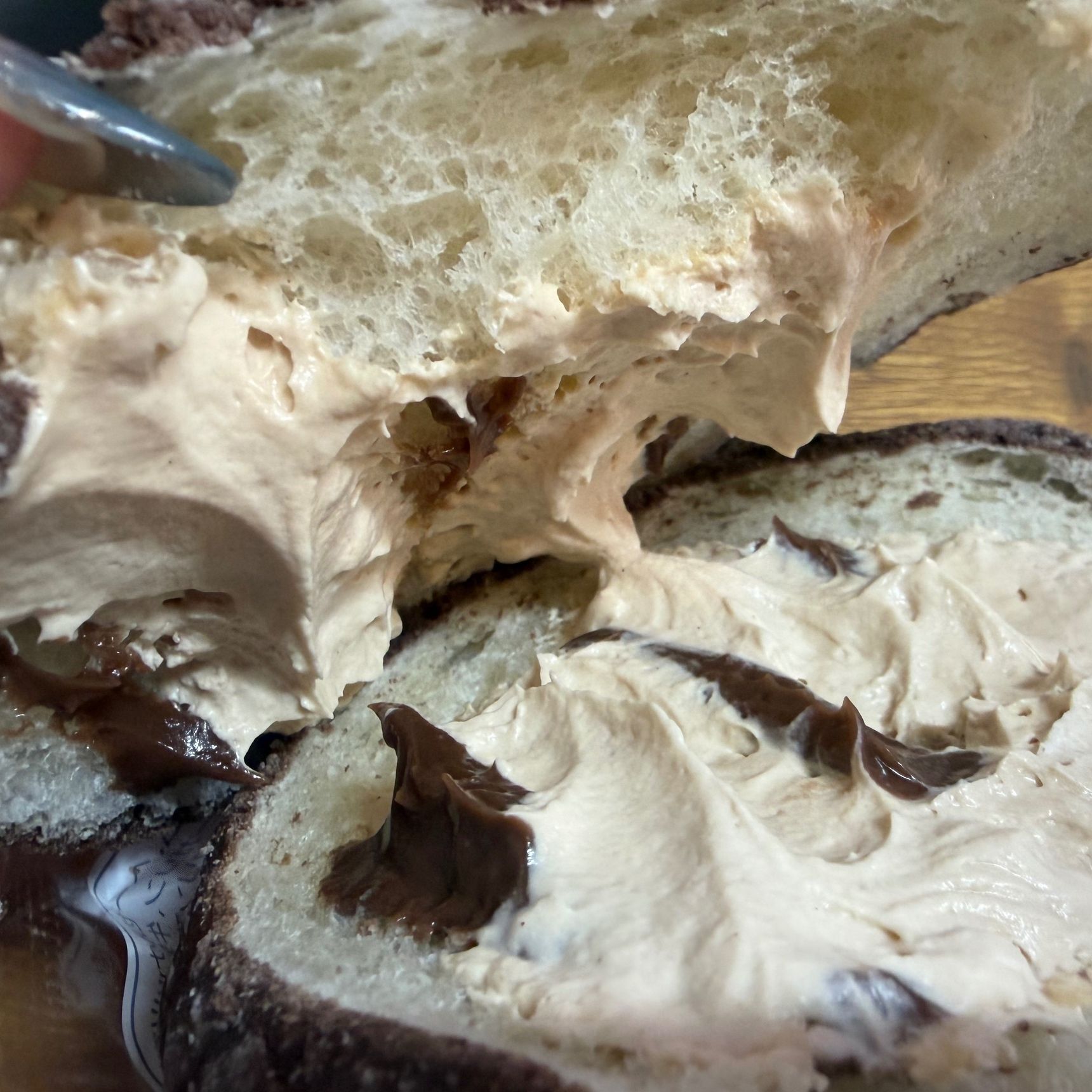 分かりにくくてすみませんが、ちぎってみるとラズベリージャムたっぷり!これが甘すぎず、ただのいちごジャムとも違い、いい感じの爽やかさ。チョコクリームも甘すぎず感動しました。