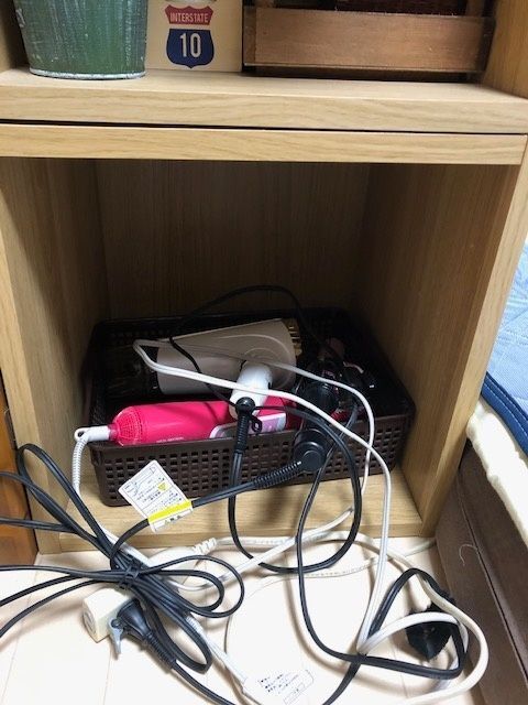 A4サイズの書類やクリアファイル、雑誌などを立てて収納するのに最適なバスケットを使う事で取り出しやすく、ざっくりとクリップでコードを束ねてずぼら主婦でも毎日きちんと片付ける事が出来るようになりました。