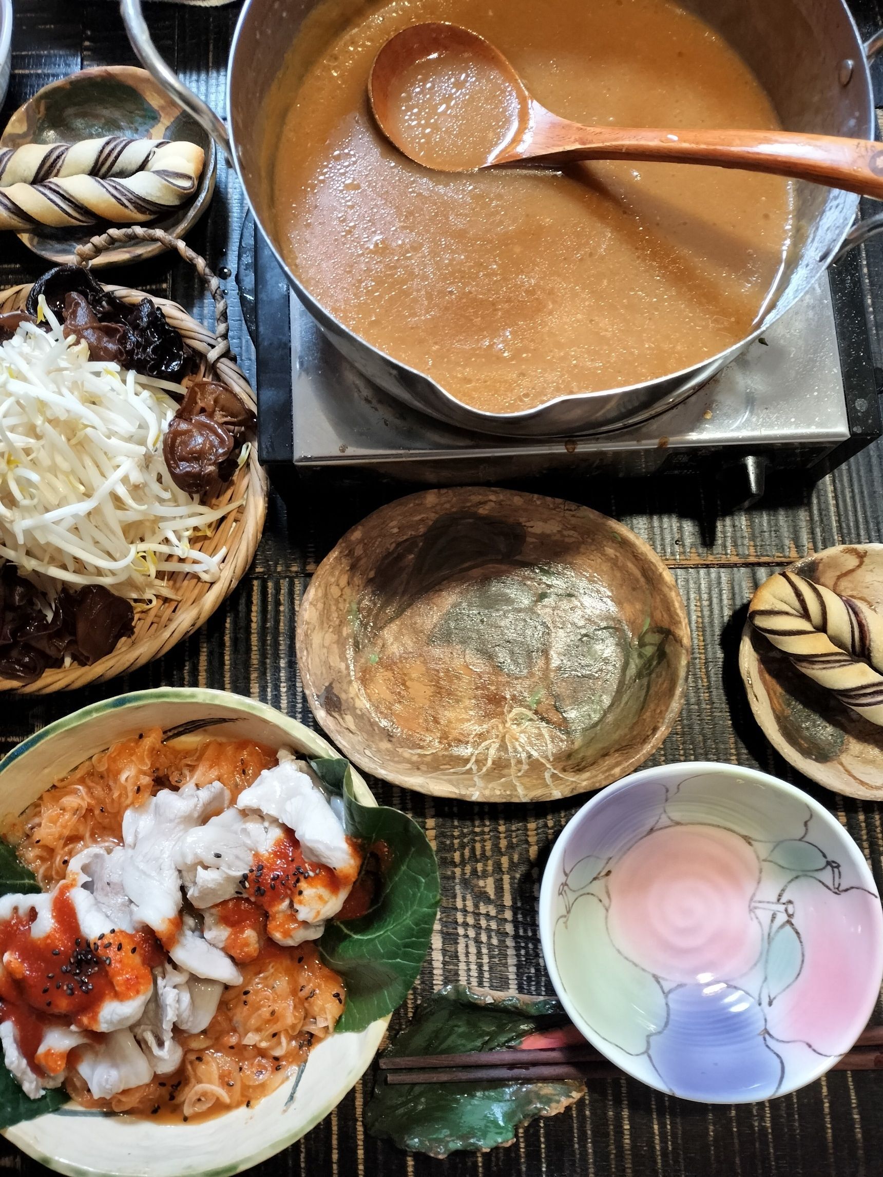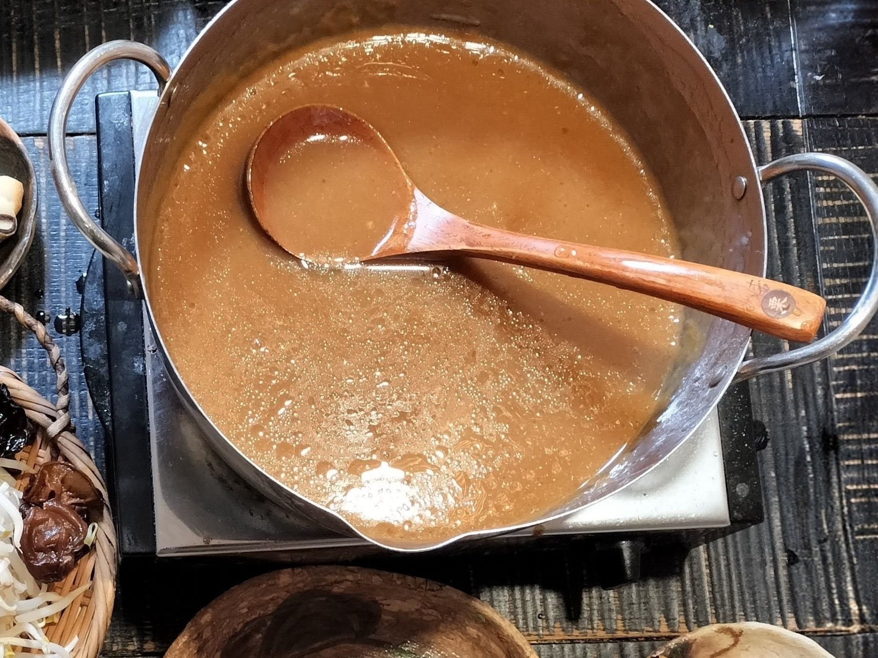 7、手順3の茹で汁に、ラーメンスープを加え、ひと煮立ちさせる→卓上ヒーターへ!