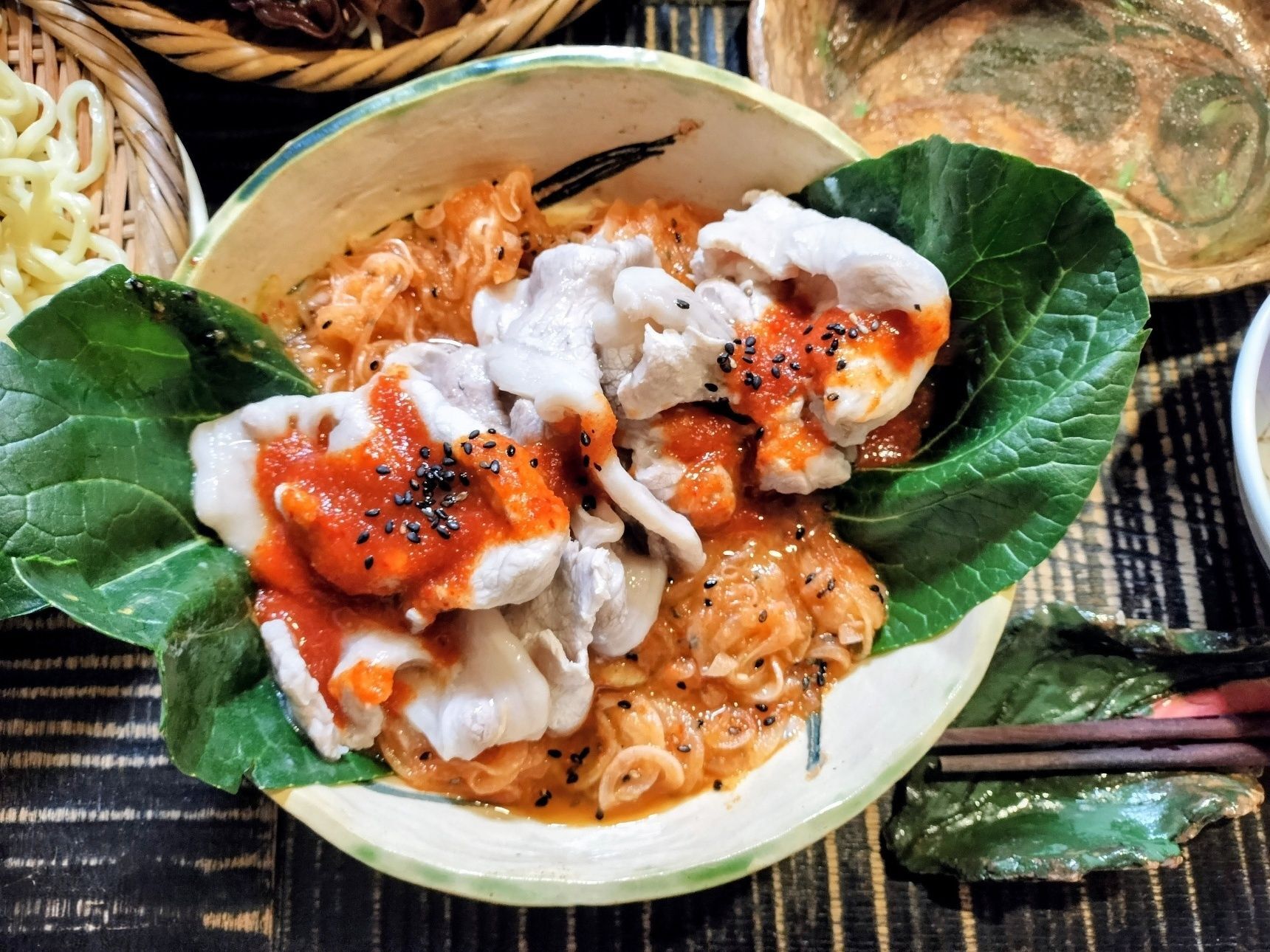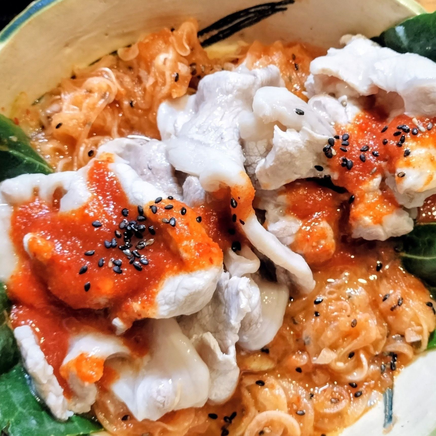 片栗粉をまぶして茹でた表面ぷるんと食感でしっとり柔らか美味しい豚ロース肉のキムチがけ・新玉ねぎの即席さっぱりキムチ!合わせて、食べると美味〜!