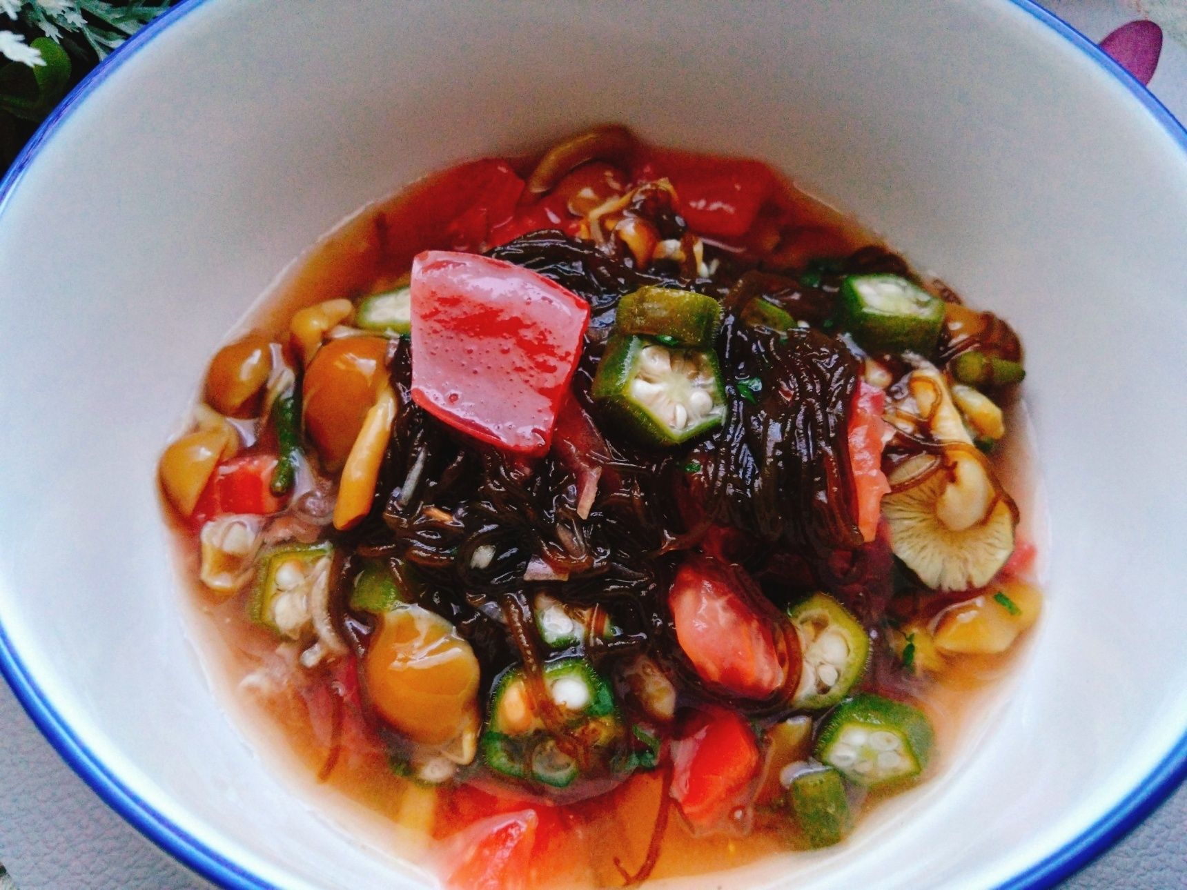 1.湯が沸騰したらオクラとなめこを1分ずつ茹でてザルに上げておく