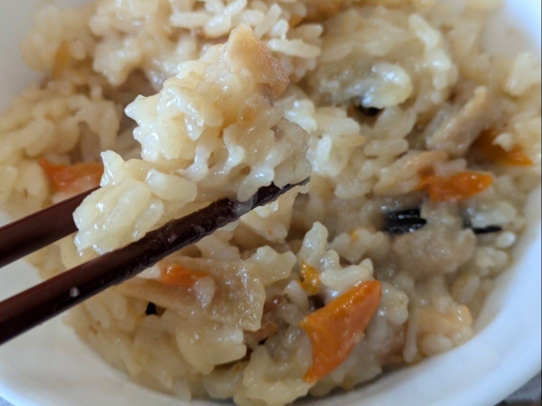 丸美屋 とり釜めしの素は、具沢山でこれだけでも十分美味しいのですが