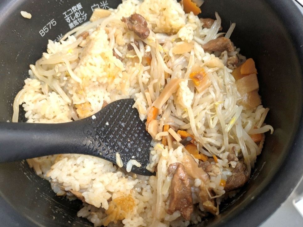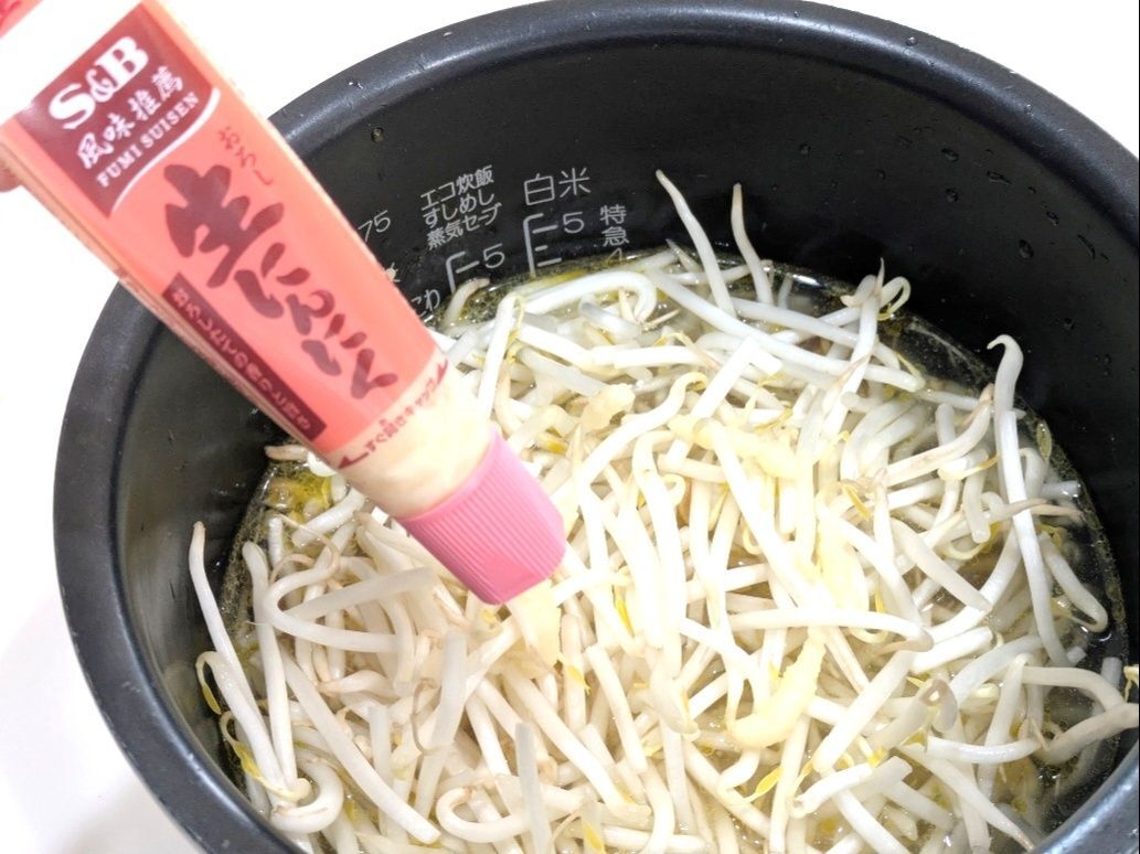 その上に豪快にもやし、にんにくを入れて「炊き込み」スイッチON。