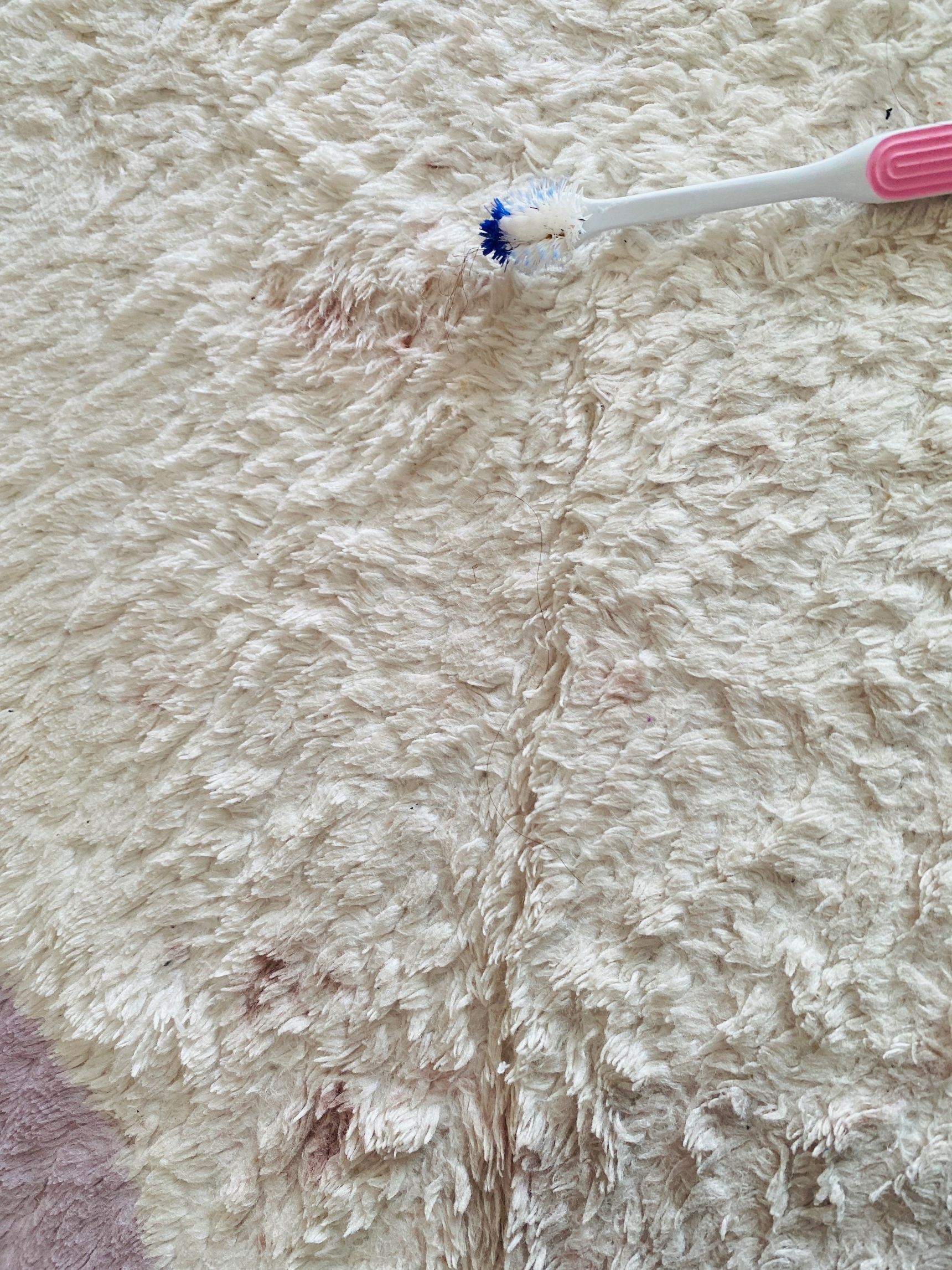 何のシミなのかは分かりませんが、洗剤をつけずに回転するように擦っていったら、汚れがかき出されたみたいで取れていきました。