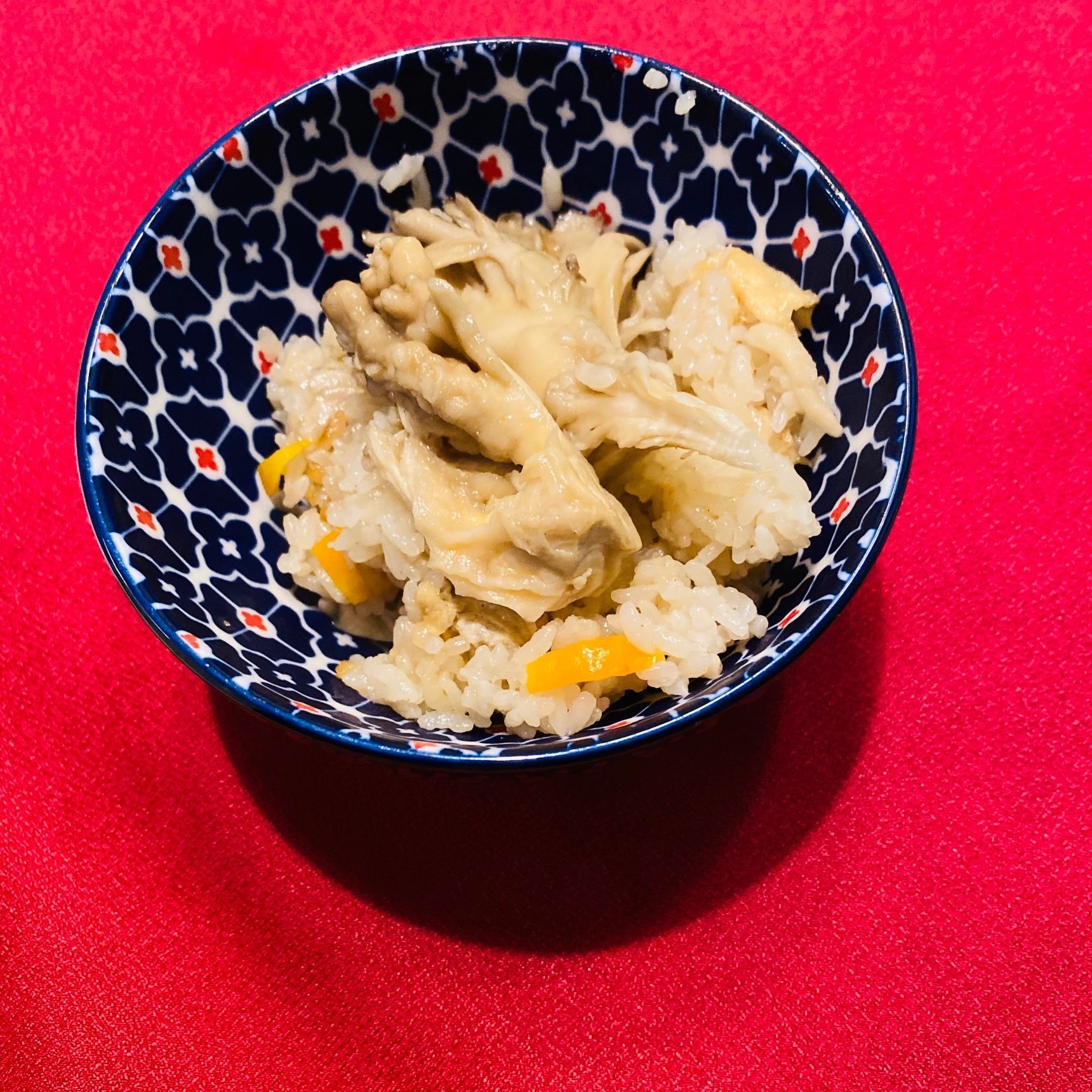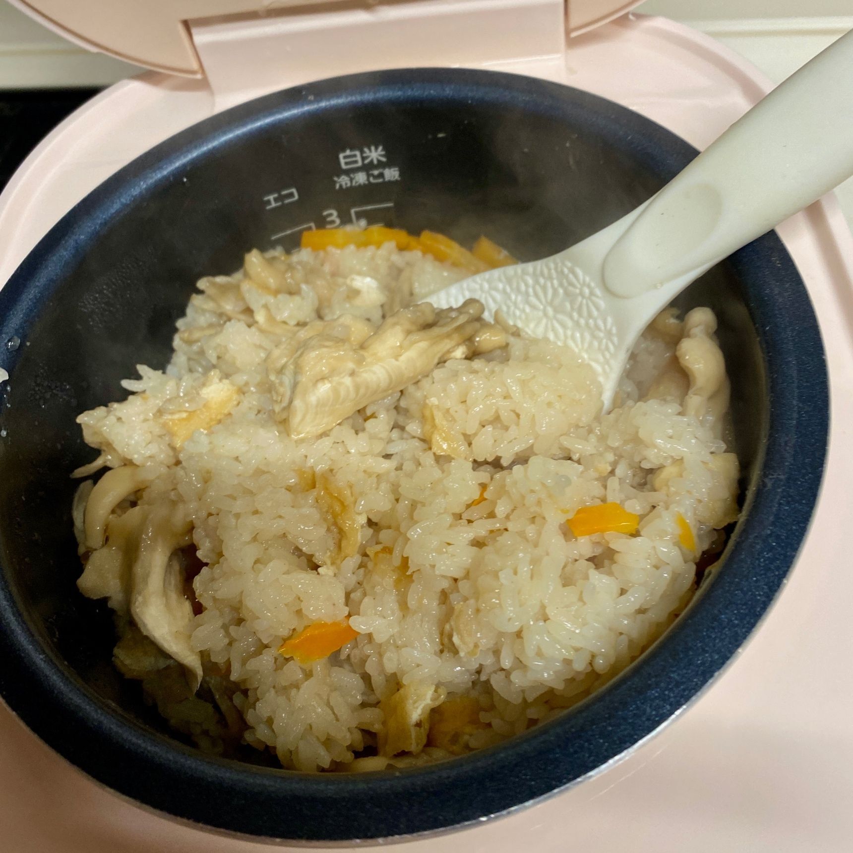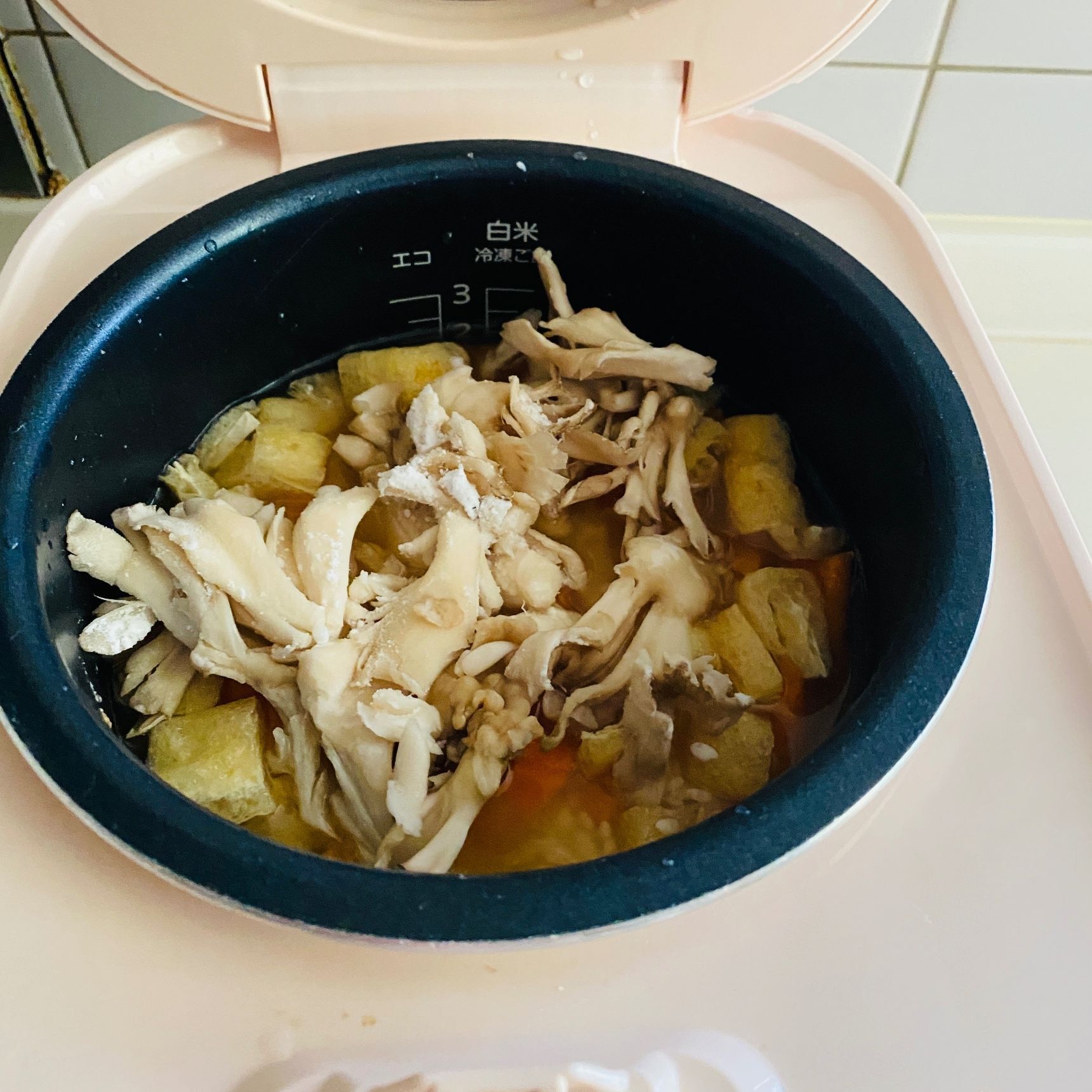お米を洗米してから、2の目盛りに水を合わせ、昆布を入れて30分浸します。細く切ったにんじん、油揚げ、舞茸、aの調味料を入れ軽く混ぜて普通炊きで炊きます。