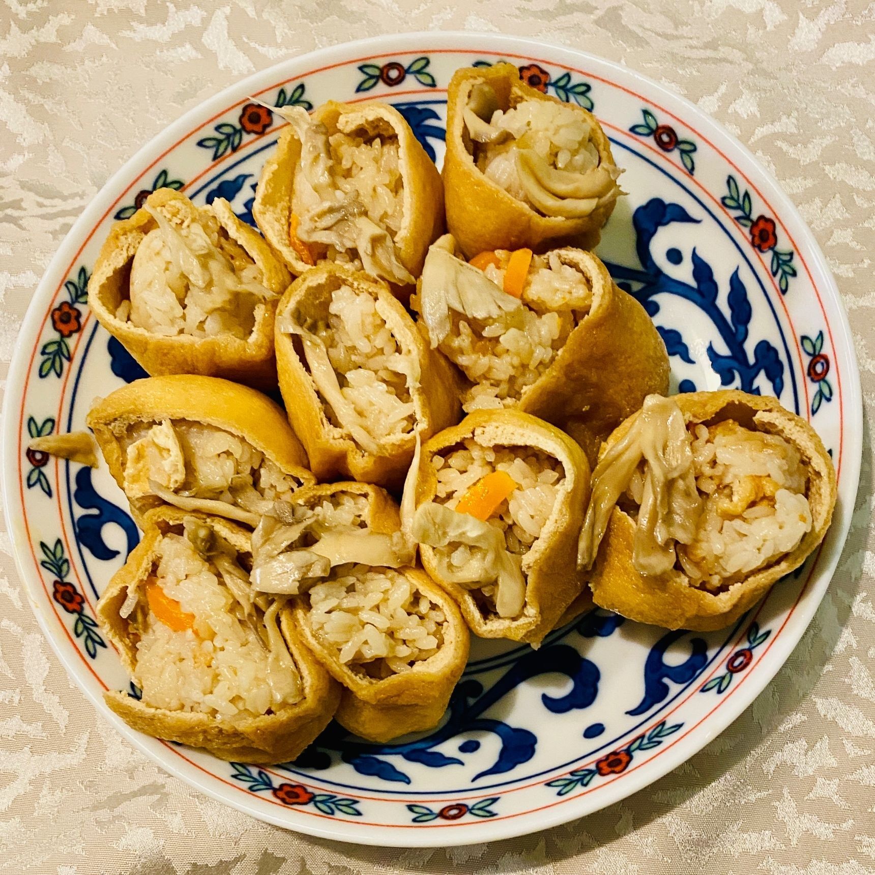 お弁当には稲荷風にしてみました。小揚げを半分に切って、油抜きをしてから、鍋にかぶるくらいの水を入れ、bの調味料を加え、含め煮します。冷めてから、煮汁を軽く絞り、舞茸ご飯を丸く握って詰めます。