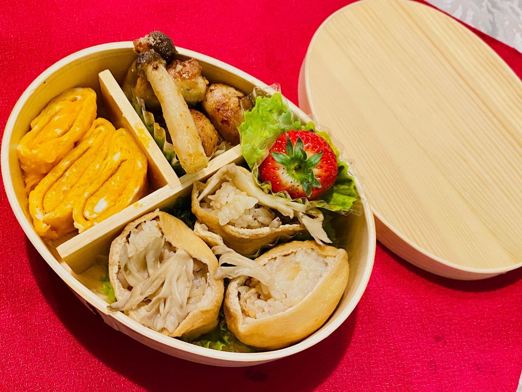 お弁当に、卵焼き、肉団子を作り、苺を添えました。